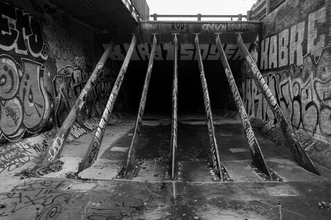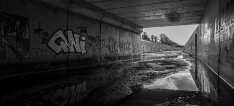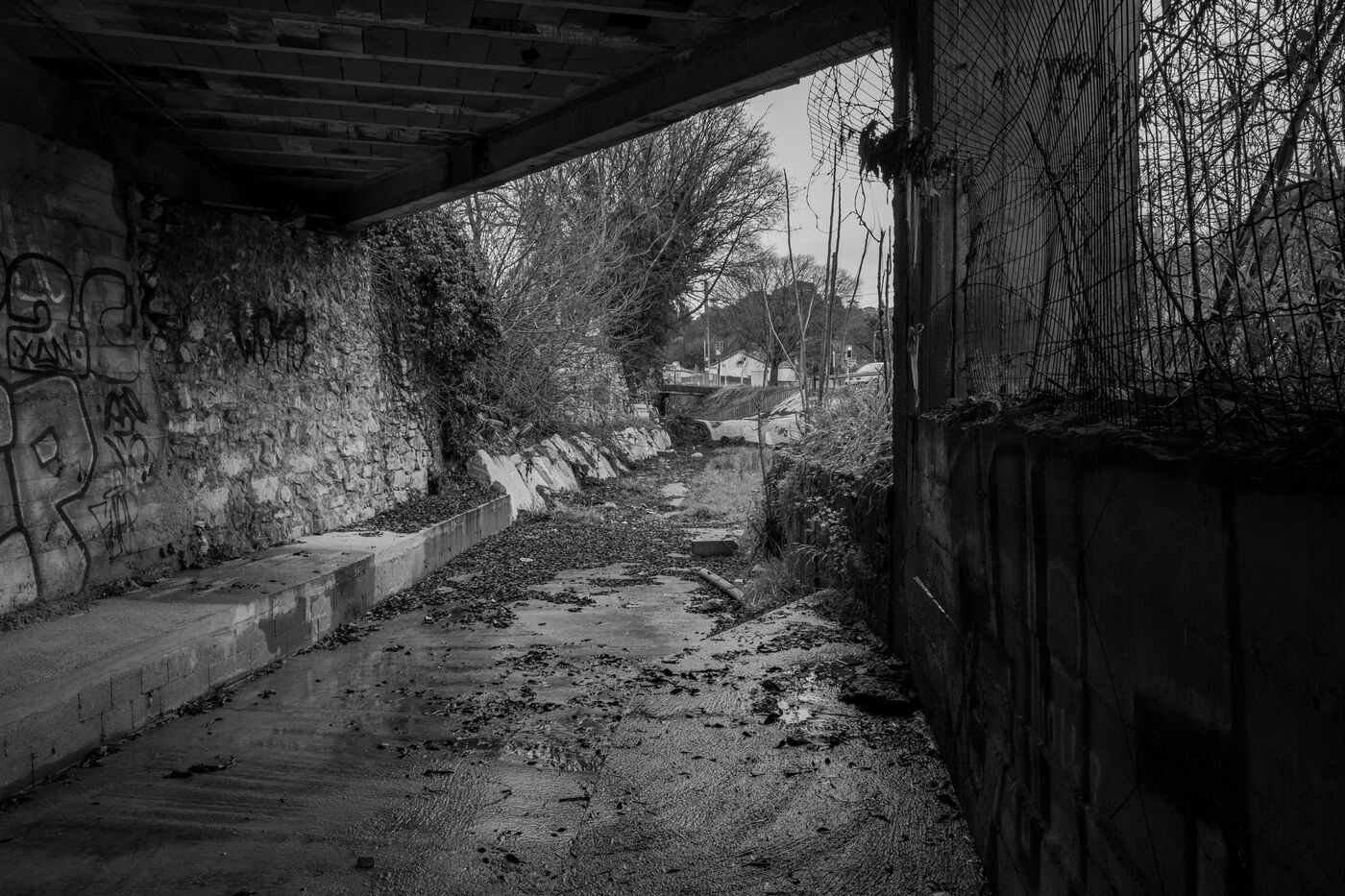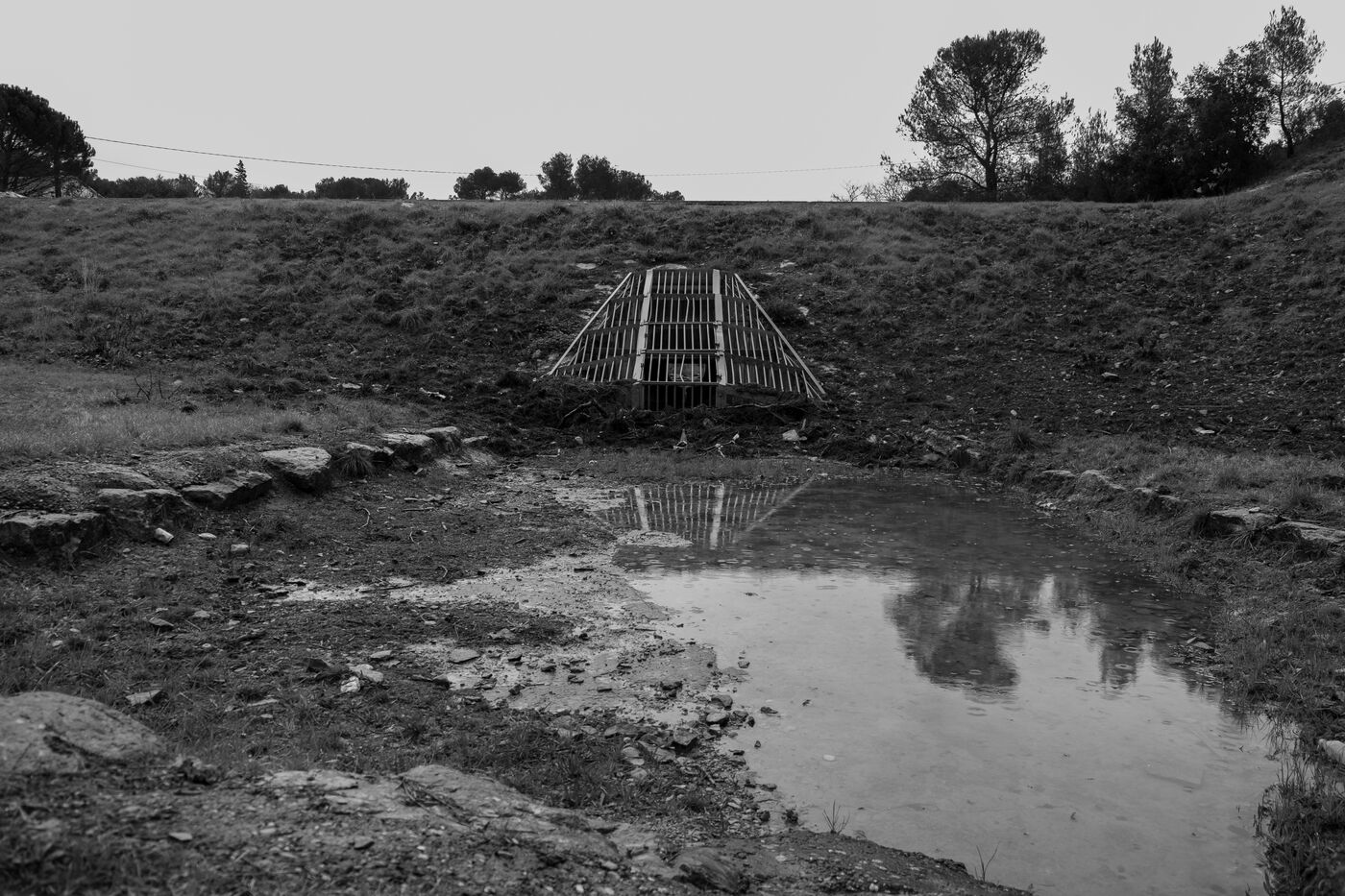 Dans cette deuxième ville, sorte de ville souterraine, se révèle une architecture qui n’est pas pensée pour les humains tant par les dimensions des ouvrages que dans les structures elles-mêmes. Enrochements, déversoirs, grilles, piquets en fer, chenaux étroits, tunnels autorisent toutefois, par un trou béant, une passerelle, le passant à traverser, surveiller, observer ces lieux somme toute inhospitaliers. Comme une romanité du futur propose une déambulation dans ce boyau inconfortable dévoilant la transformation progressive d’un paysage rural vers un paysage urbanisé à l’extrême.