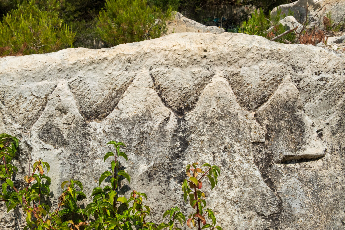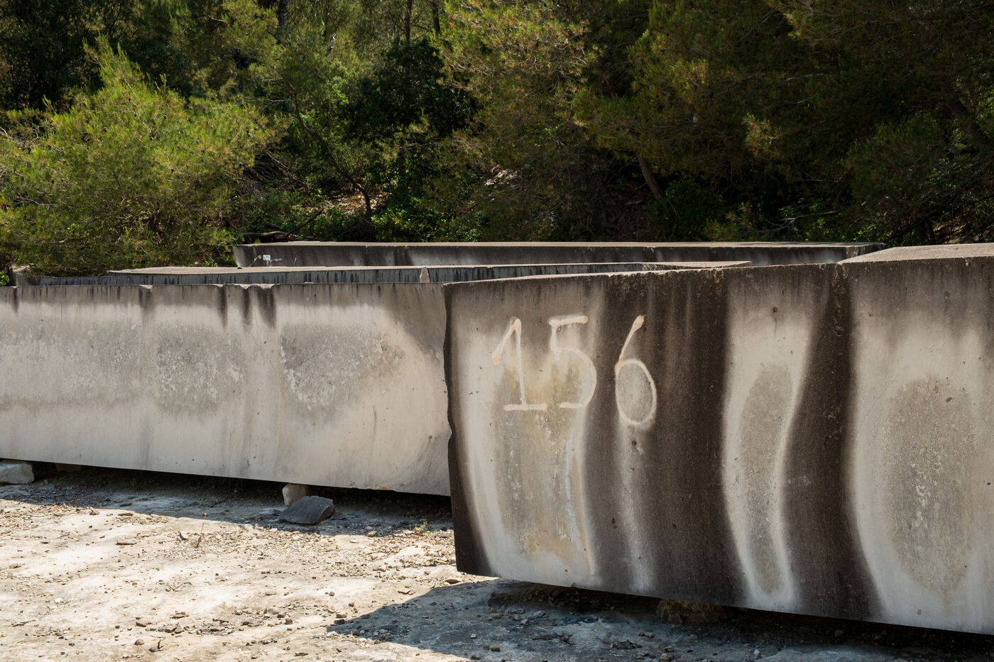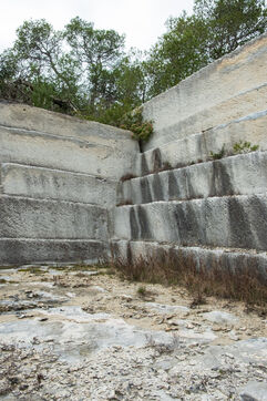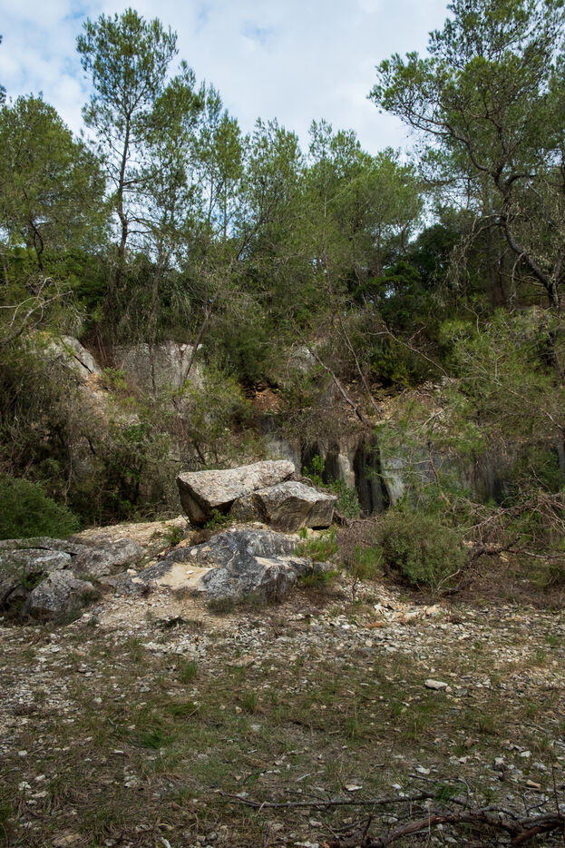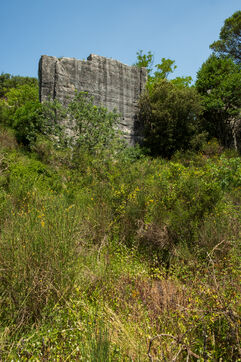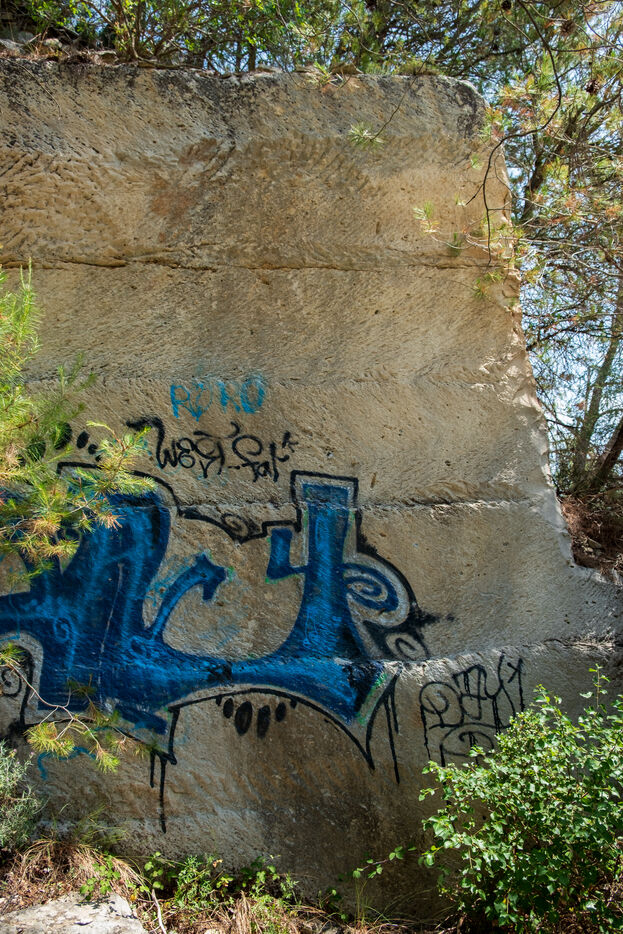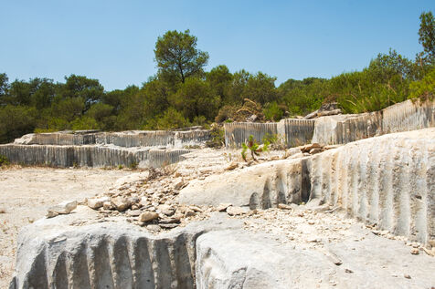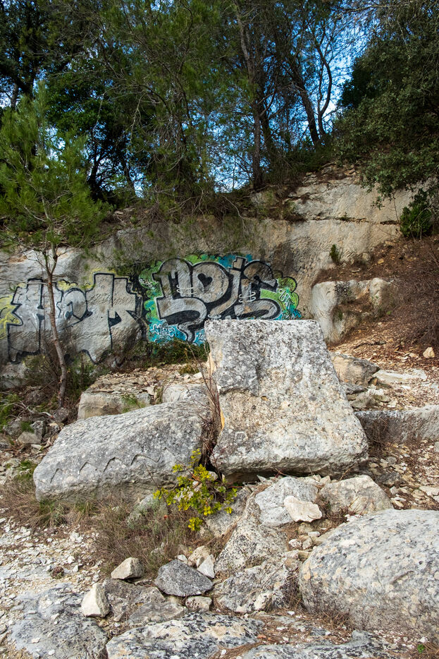 The operation of the old Barutel quarryThe Barutel quarry was used for quarrying massive blocks of limestone from Roman times until 1991 to build and restore monuments in Nîmes. The old quarry retains abundant and exceptional traces of Roman quarrying techniques, like these traces of "the escoude", a pickaxe with a long handle ending in a flat chisel and a point. The impressive quarry face rises to over ten meters high, and some isolated sections of wall within the quarry reach eight meters. Abandoned despite its heritage value, the old Barutel quarry is now a playground for graffiti artists and skateboarders and sometimes serves as a dumping ground. There are no signs on site indicating that it is a listed historical monument.