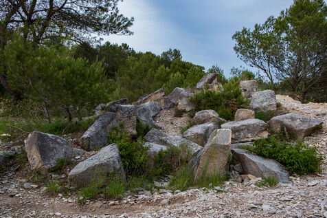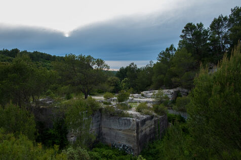 Deux carrières de pierre calcaire se font face au nord de Nîmes, sur la route d’Alès, l'une ancienne et abandonnée, l'autre moderne et exploitée.