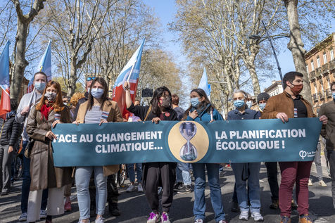 A la veille du débat sur la loi pour « la lutte contre le dérèglement climatique » à l'Assemblée nationale, plus de 30 organisations et associations ont invité à rejoindre le mouvement national pour une vraie loi climat. Le projet de loi, issu de la convention citoyenne, ayant été jugé trop timide. Des rassemblements ont eu lieu dans près de 160 villes en France. Selon les organisateurs, 11 000 personnes ont défilé partout en France. Toulouse le 28 mars 2021.