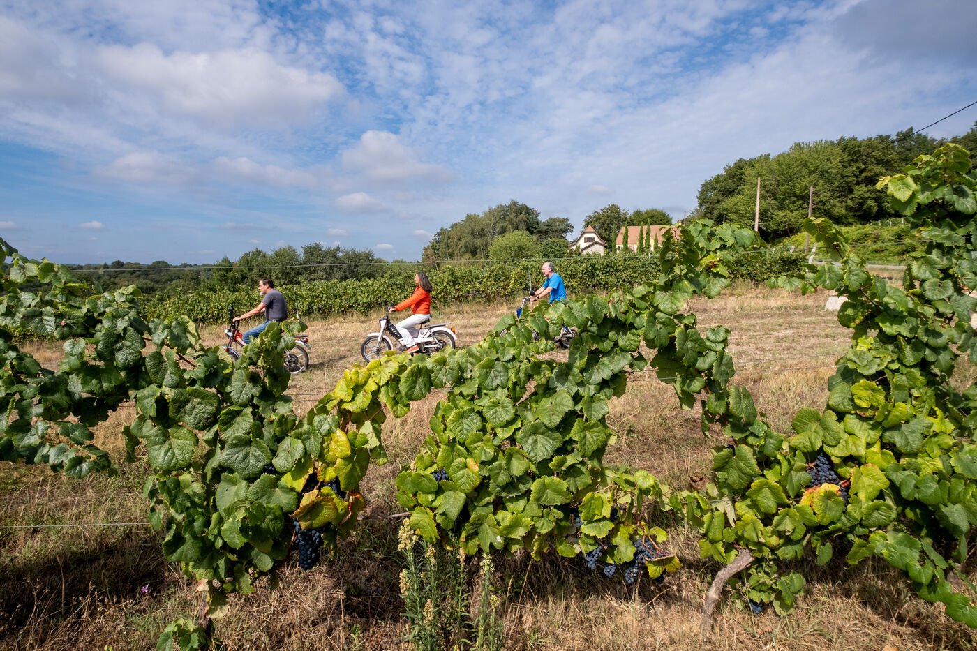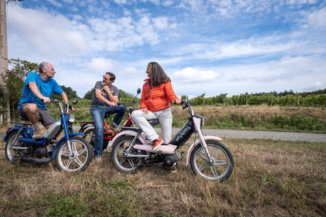 In the wine region of Madiran, in the department of Gers, a couple organises local tours on vintage mopeds. Visiting cellars, historical monuments or architectural treasures, Dominique guides his clients to the secret corners of his department at the slow pace of the fleet of vintage mopeds that he has conscientiously renovated.