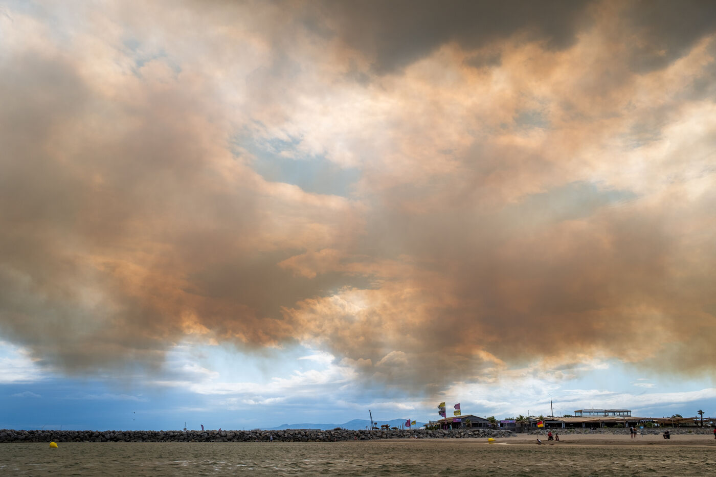 With severe drought conditions and strong winds blowing for several days, forest fires are breaking out daily in the Aude department. Here, the plume of smoke from the Bizanet fire casts a shadow over holidaymakers on Gruissan beach.