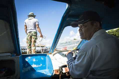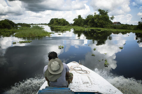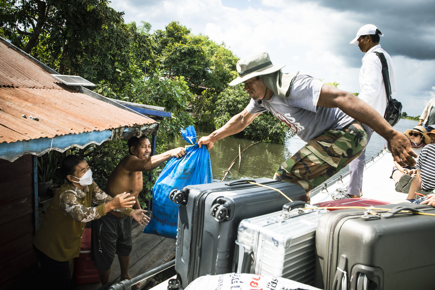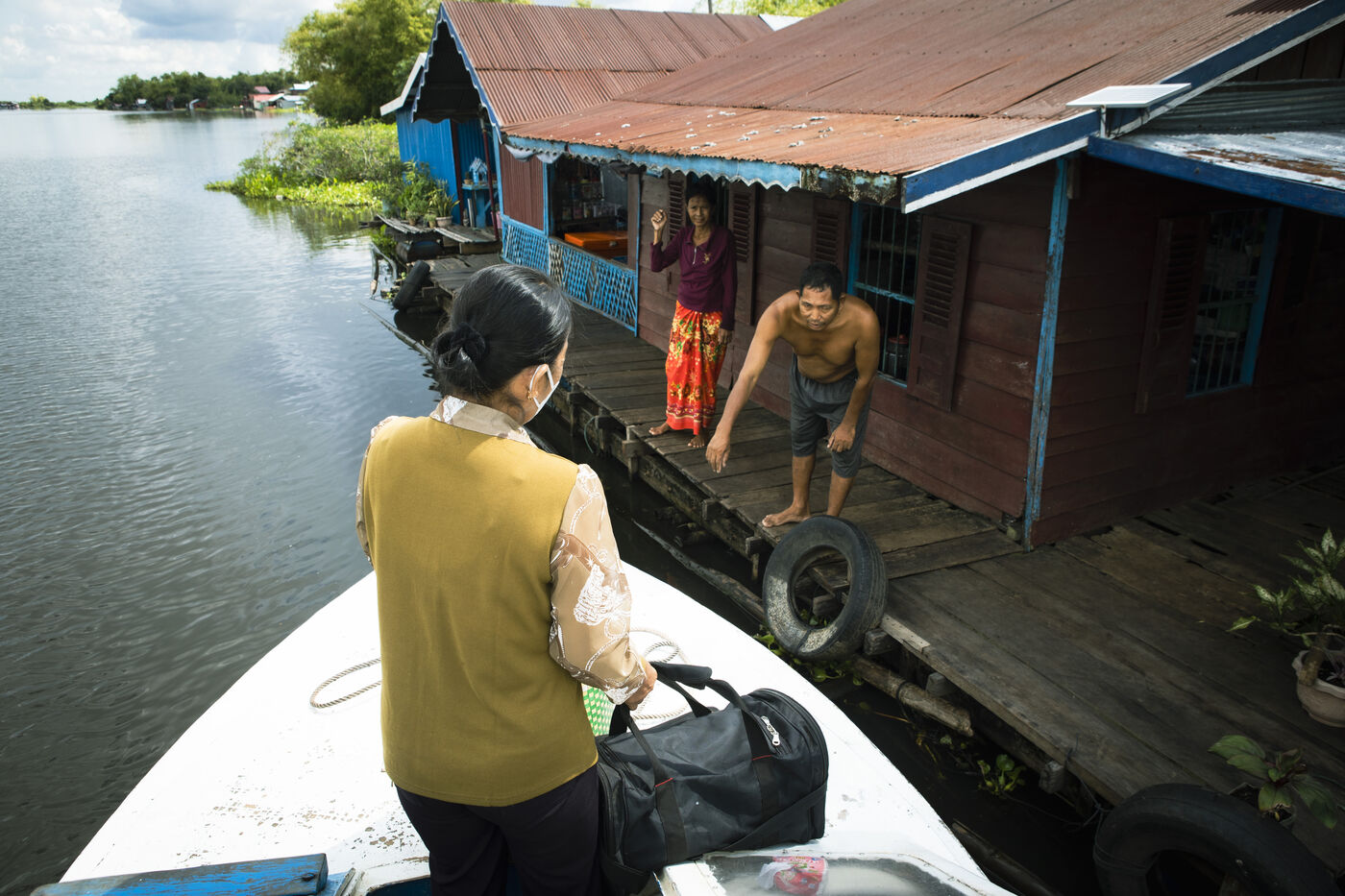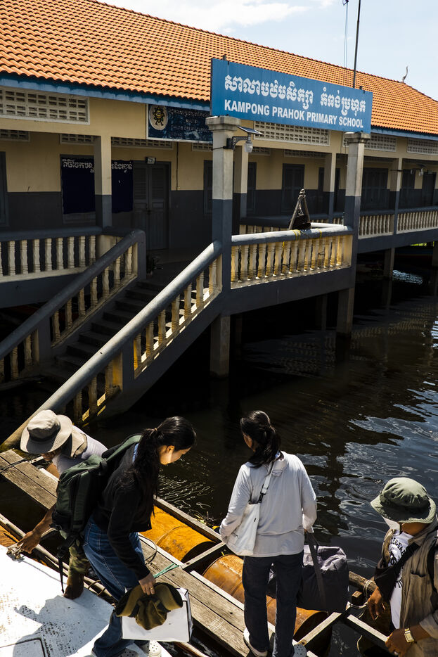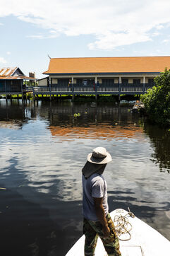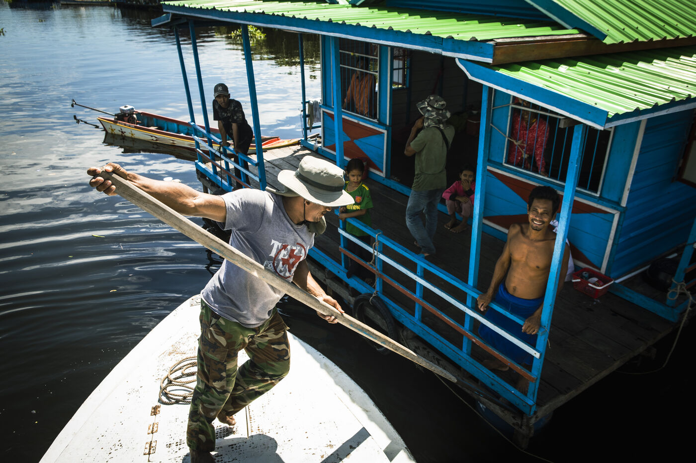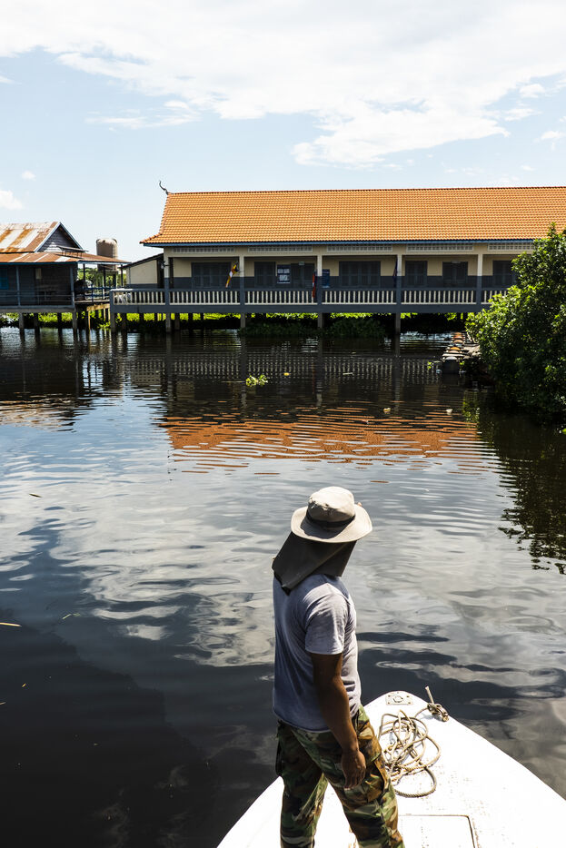 During the rainy season, between Battambang and Siem Reap, a small cab boat belonging to the Angkor Express Boat company, founded by Cambodians, carries passengers and supplies to isolated floating villages on the Sangker River.