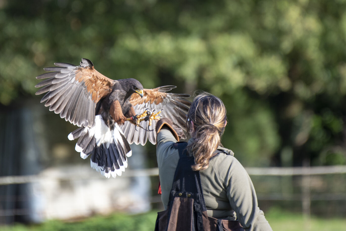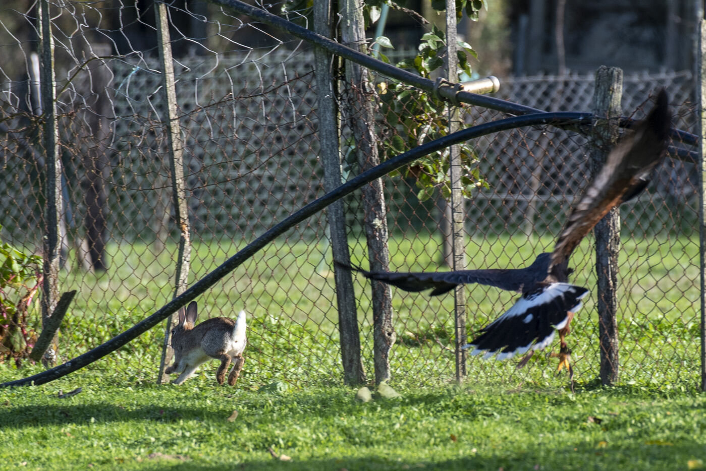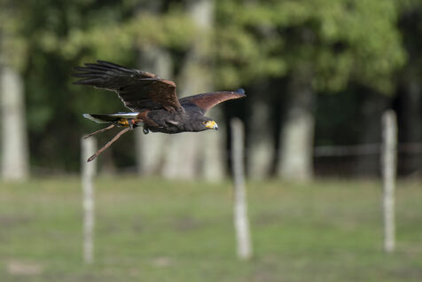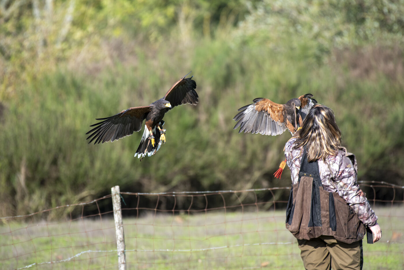 Falconers use Harris hawk and ferrets to hunt rabbits. Falconers intervene at the request of homeowners, often in areas close to dwellings where it is impossible to shoot rabbits. The ferrets are sent into the burrows to flush out the rabbits, which are then captured by the buzzards.