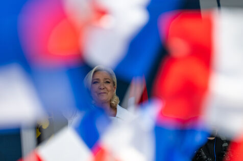 Portraits of Marine Le Pen and Jordan Bardella during the victory celebrations