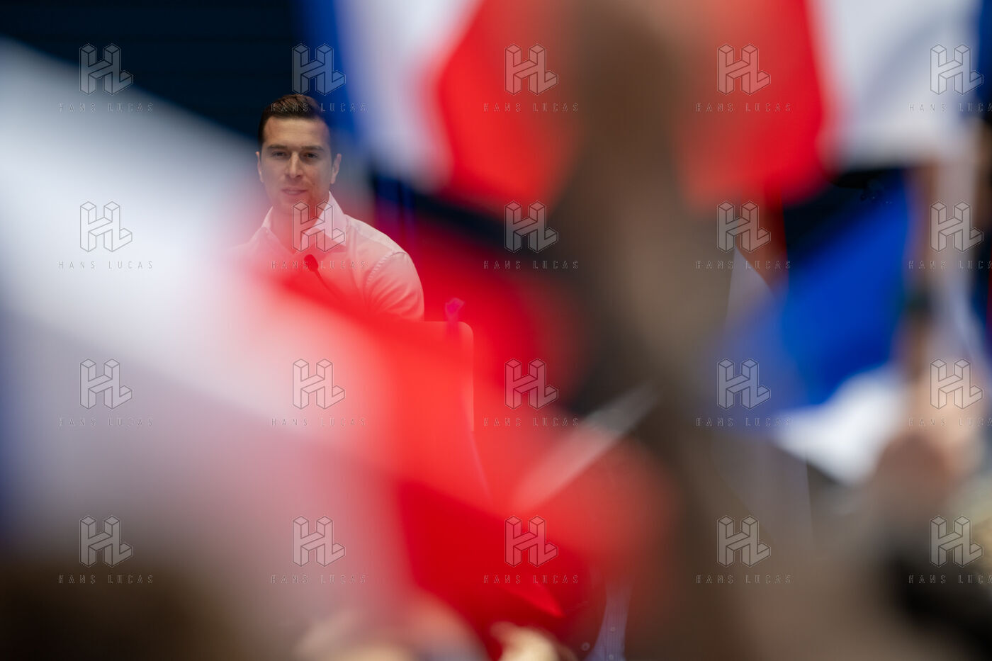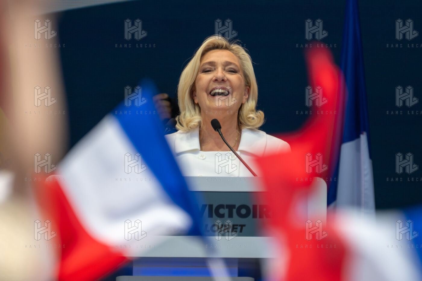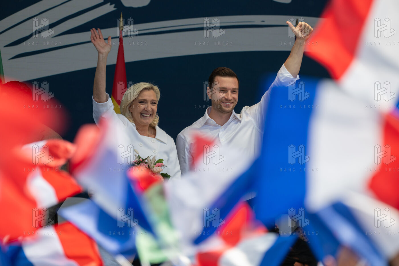Marine Le Pen and Jordan Bardella at the victory party organised to celebrate the far-right parties' results in the 2024 European elections.