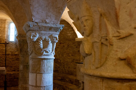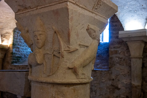 The crypt beneath the choir is the most interesting and best-preserved part of the building. Its layout features three naves with four bays, the last of which is shaped like an enveloping apse. The central columns have capitals carved with fantastical figures and animals.