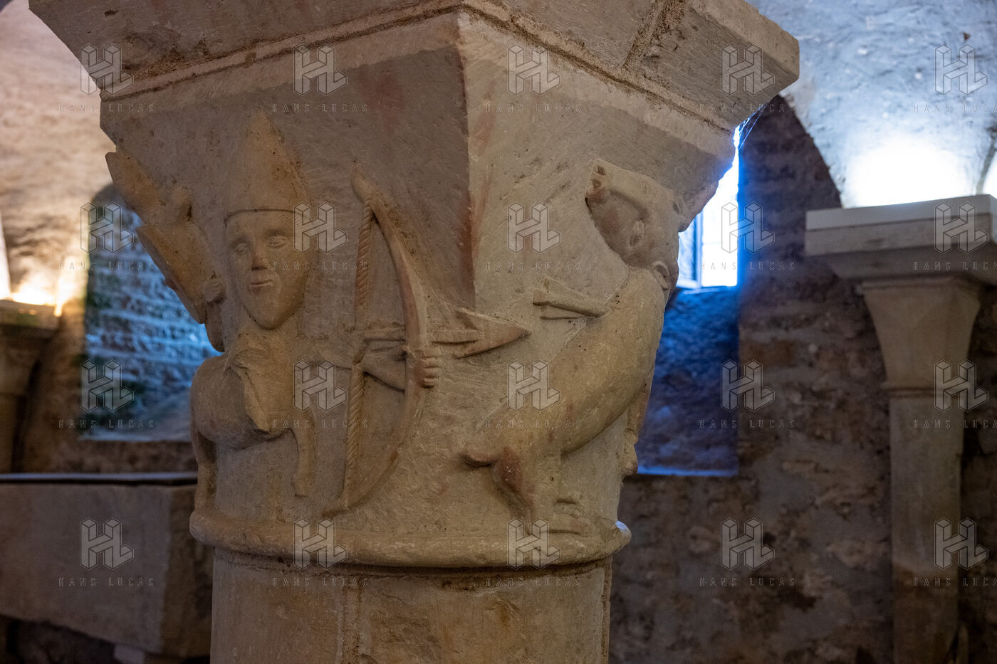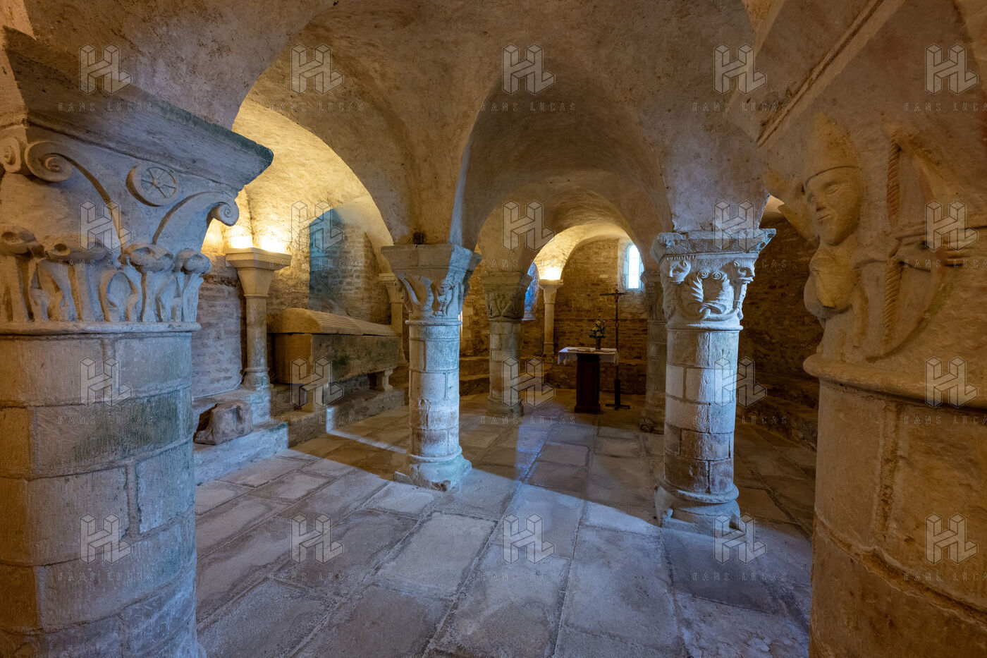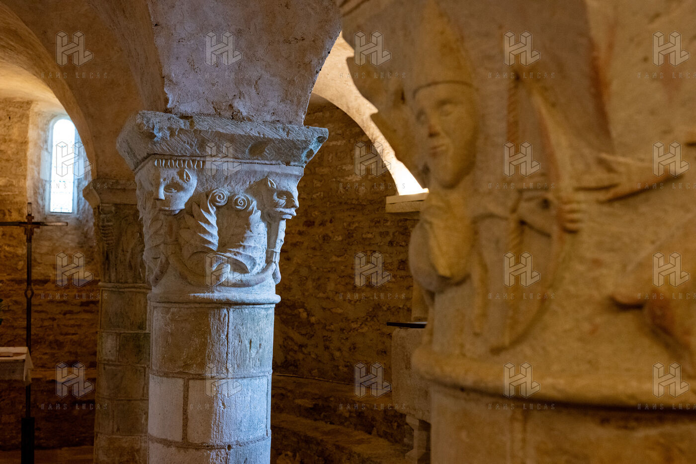 La crypte sous le chœur est la partie la plus intéressante et la mieux conservée de l’édifice. Son plan présente trois nefs de quatre travées, dont la dernière est en forme d’une abside enveloppante. Les colonnes centrales possedent des chapiteaux sculptés de personnages et animaux fantastiques.