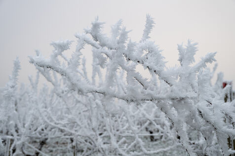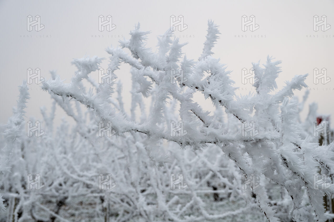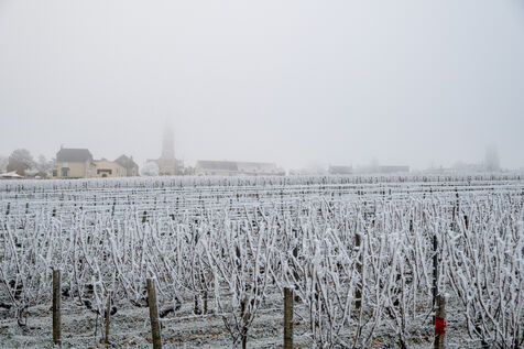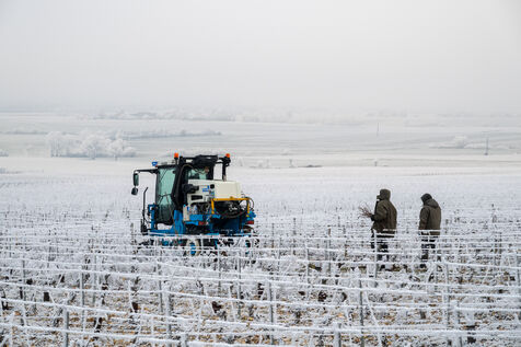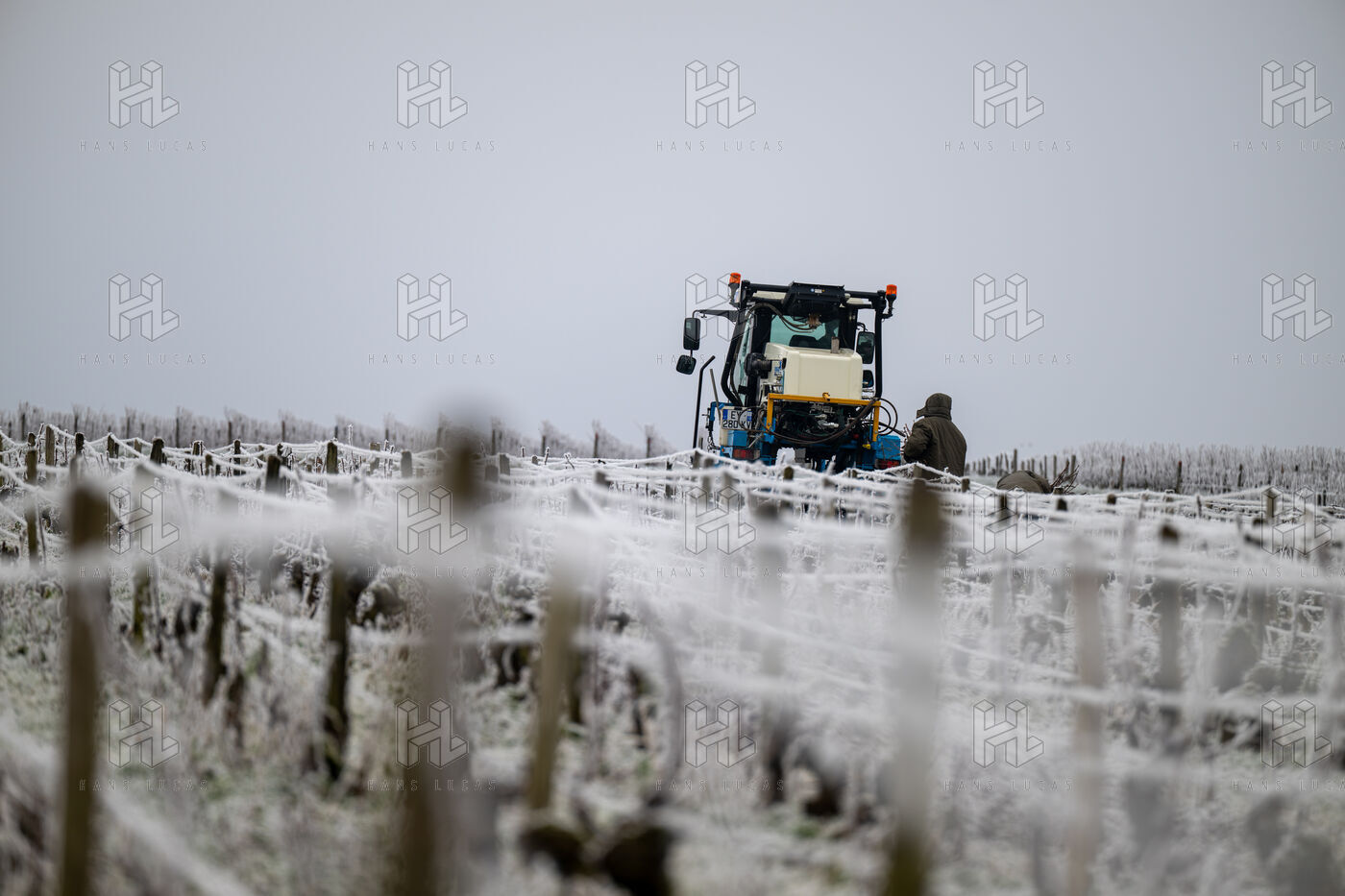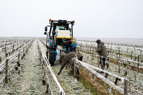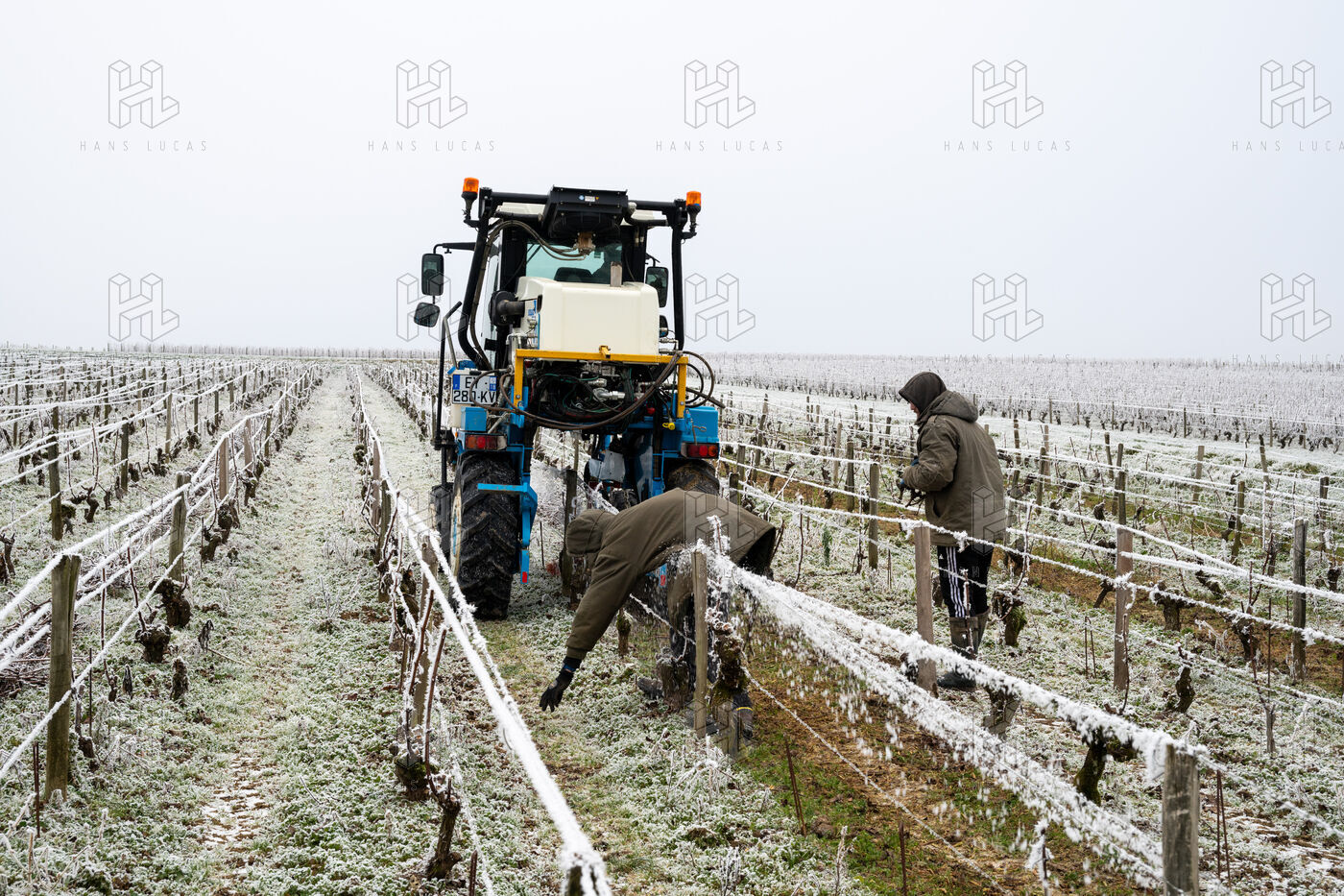 While the surrounding vines and trees are covered in white frost, the winegrowers at the Pouilly Fumé Francis Blanchet estate are shredding the vine shoots left on the ground after pruning, which will be used to fertilise the soil.