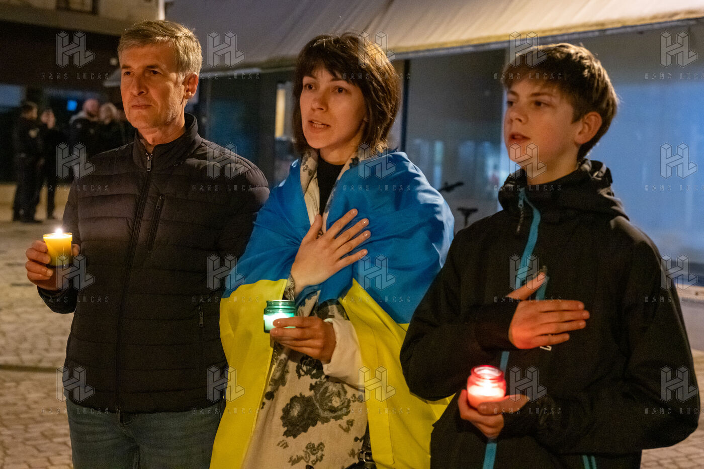 L'association Le 58 Solidaire avec l Ukraine a organisé un rassemblement dans le centre de Nevers pour commémorer les 4 ans de guerre et rendre hommage aux victimes. Plusieurs réfugiés Ukrainien sont présent dont Viktoriia Kovalevska drapée dans un drapeau Ukrainien, son fils Danylo Kovalevskyi et son mari, en France depuis fevrier 2023.