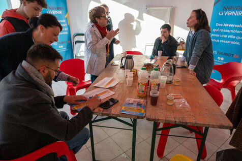 Every morning, the campaign team for incumbent mayor Denis Thuriot meets at the campaign office for breakfast to review progress and plan the day’s activities.