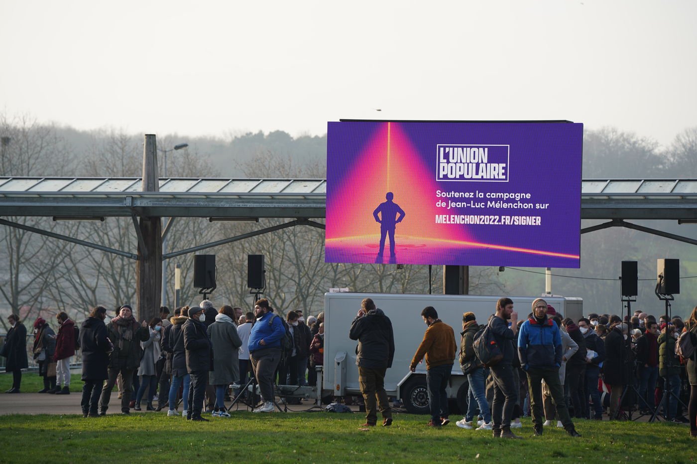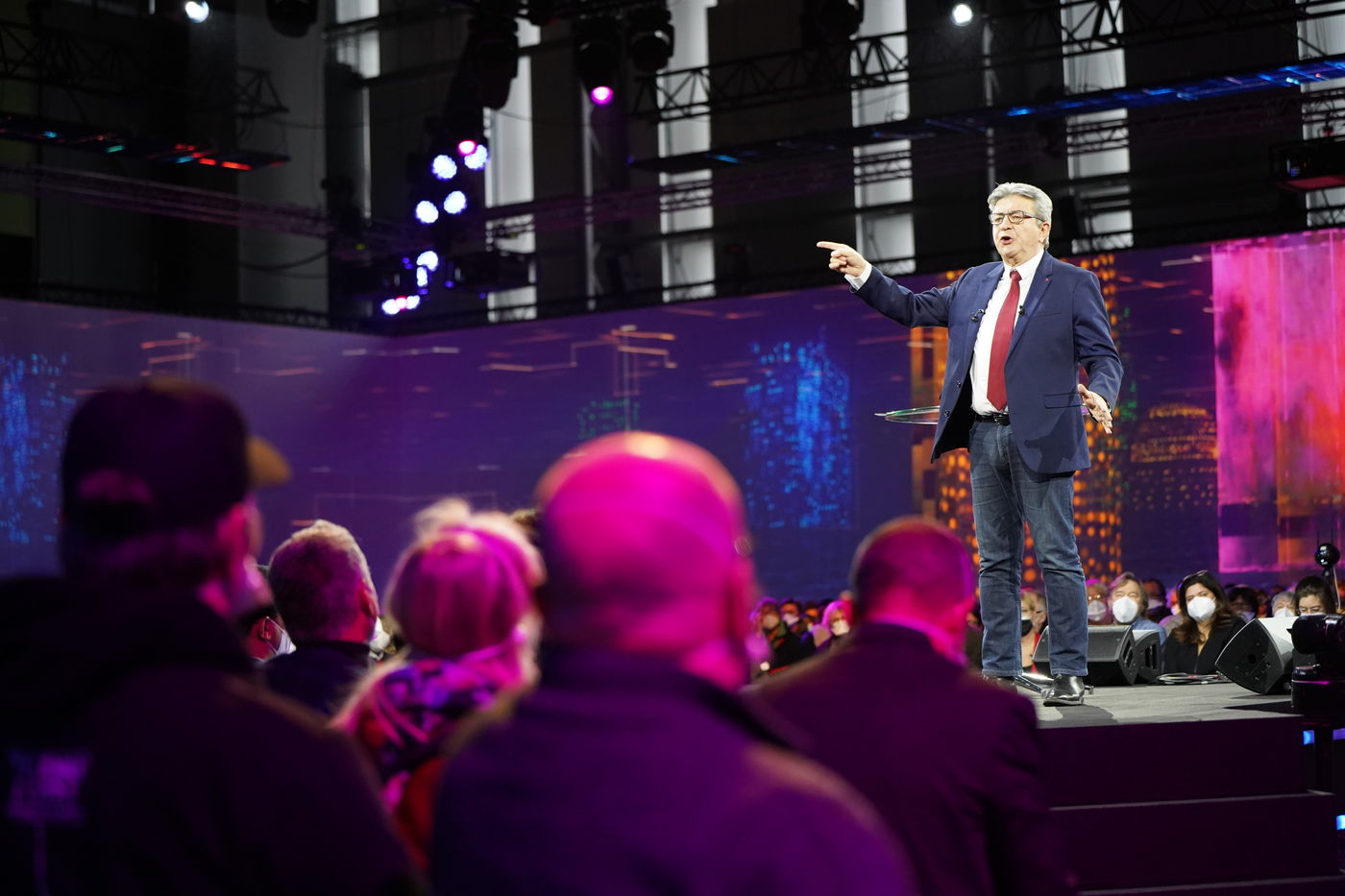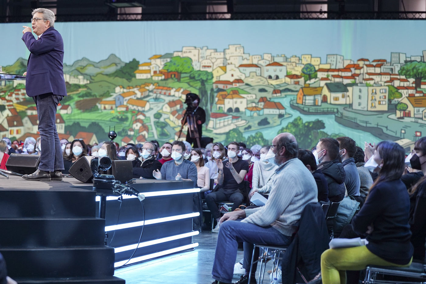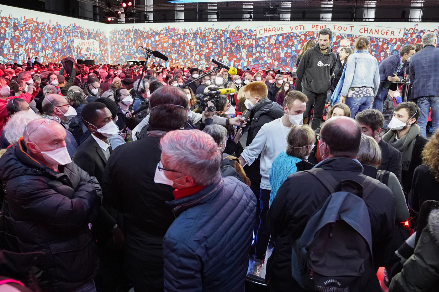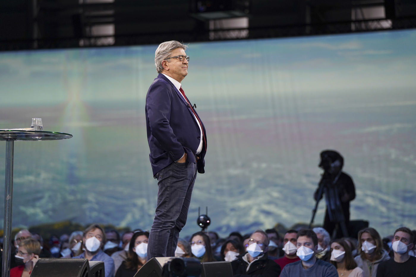 Dans le cadre de la campagne politique à l'élection présidentielle de 2022, Jean-Luc Mélenchon tient une réunion publique à Nantes, dimanche 16 janvier 2022. Ce meeting immersif et olfactif se veut une première mondiale.
