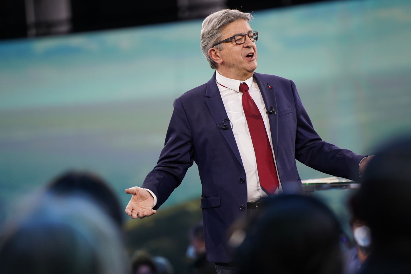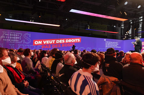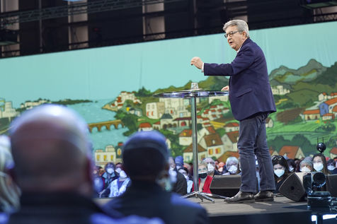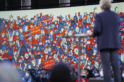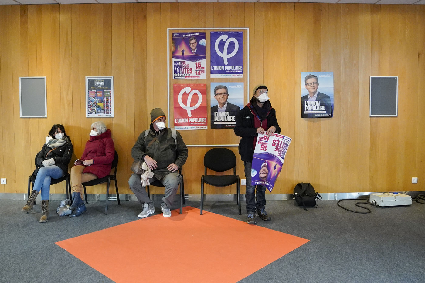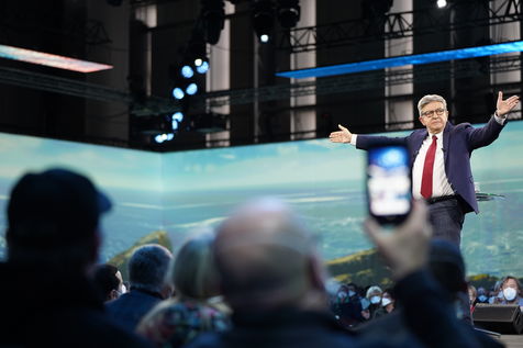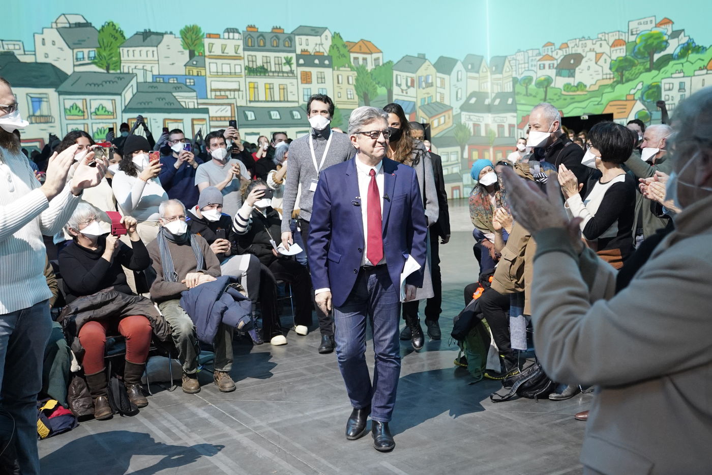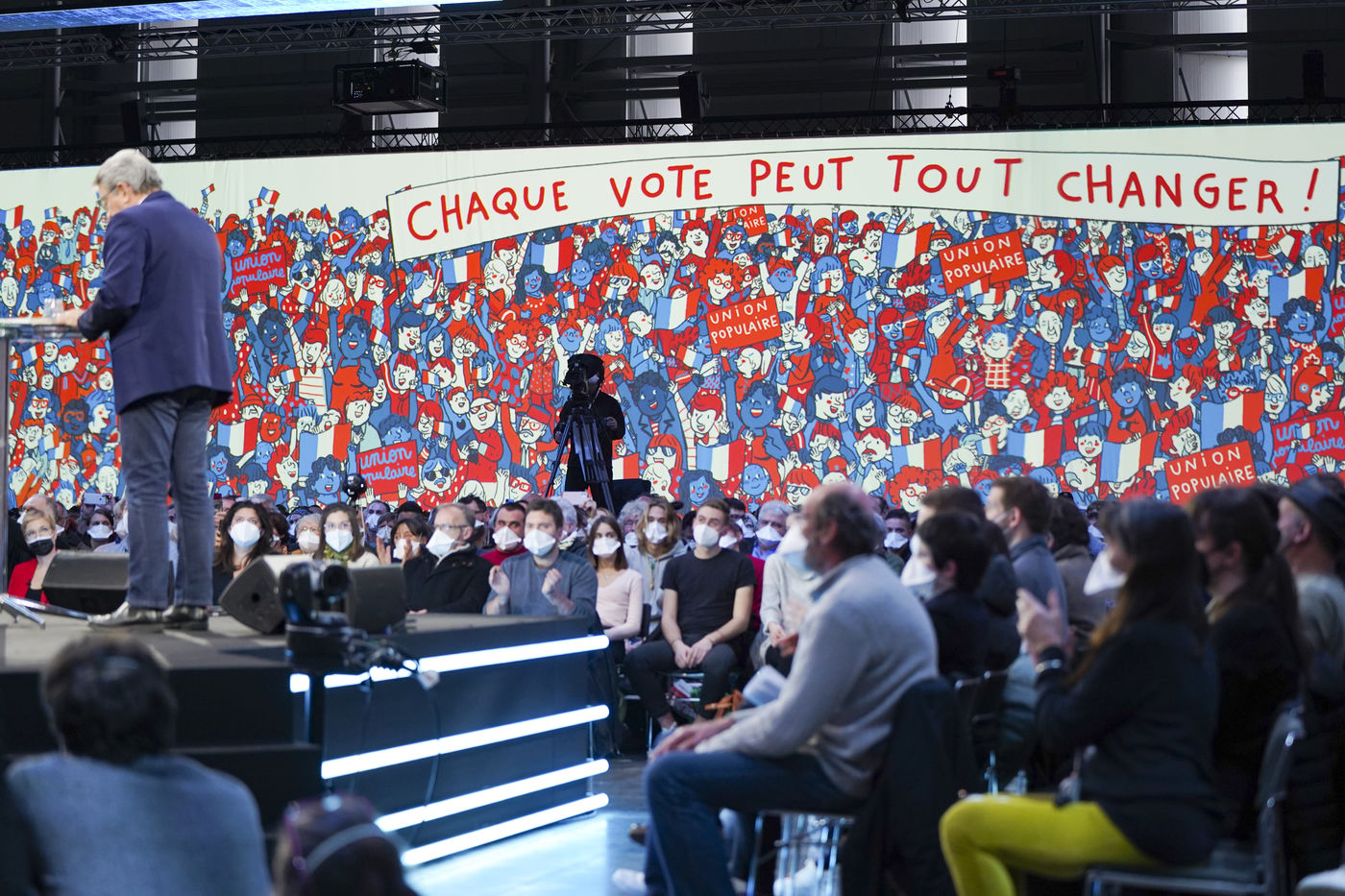 Dans le cadre de la campagne politique à l'élection présidentielle de 2022, Jean-Luc Mélenchon tient une réunion publique à Nantes, dimanche 16 janvier 2022. Ce meeting immersif et olfactif se veut une première mondiale.