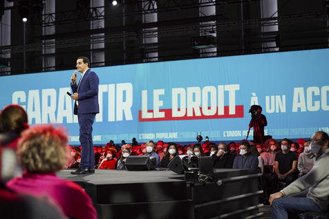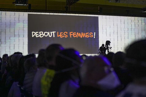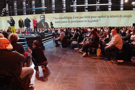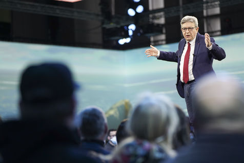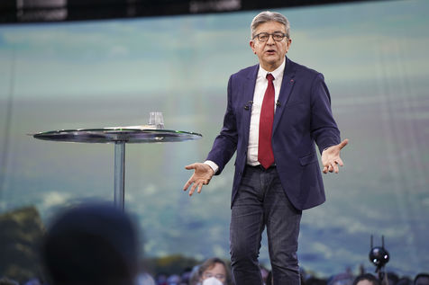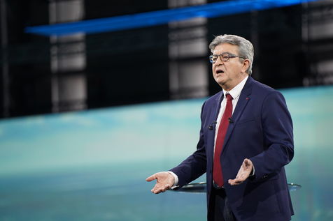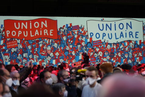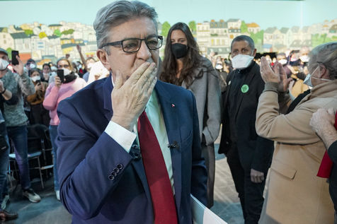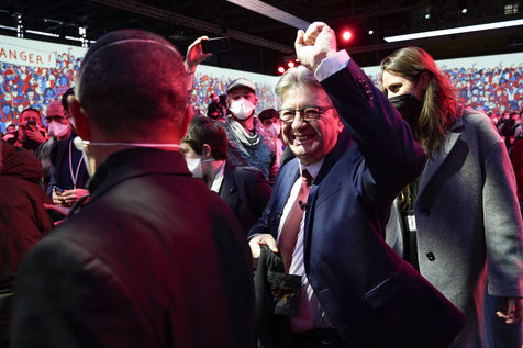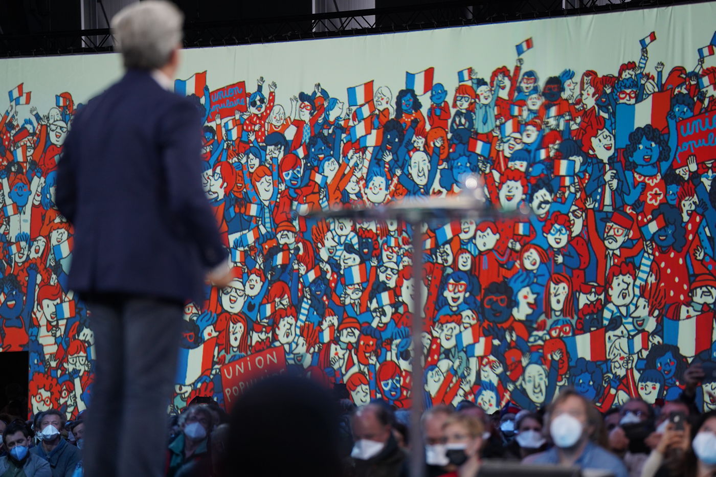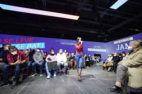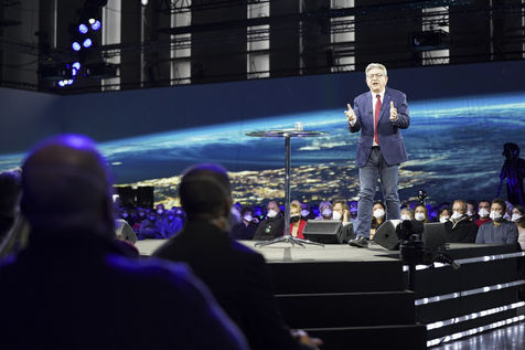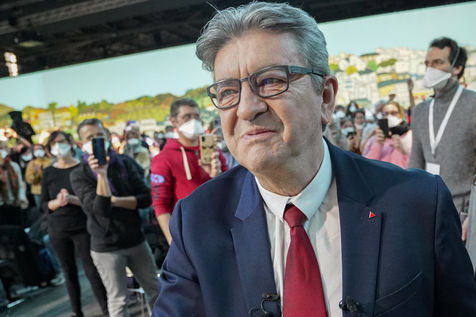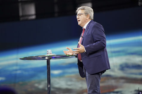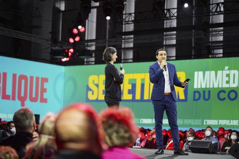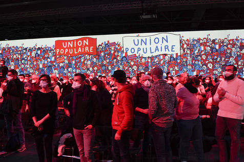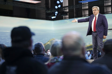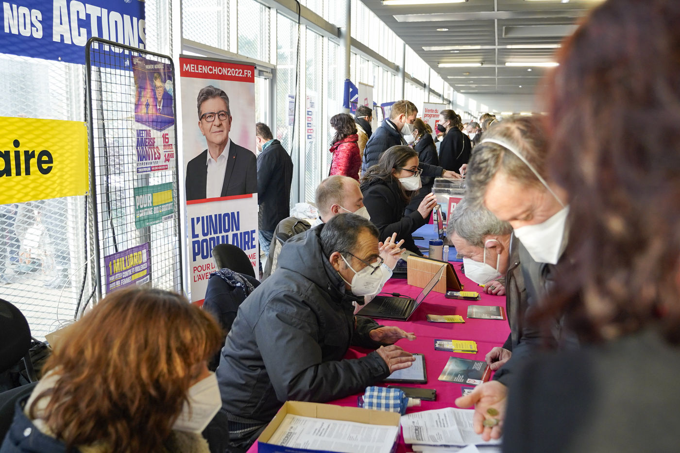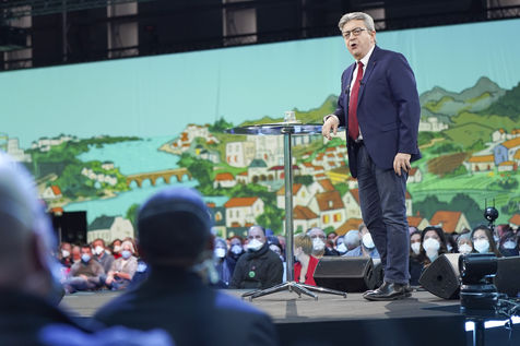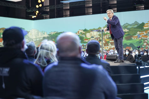 Dans le cadre de la campagne politique à l'élection présidentielle de 2022, Jean-Luc Mélenchon tient une réunion publique à Nantes, dimanche 16 janvier 2022. Ce meeting immersif et olfactif se veut une première mondiale.