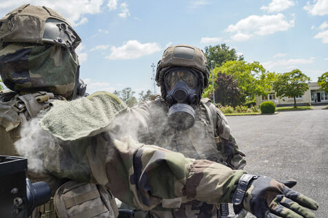 Spécialistes pour faire face aux menaces nucléaires, radiologiques, biologiques et chimiques (NRBC), les soldats du 2e régiment de Dragons s?entrainent dans le cadre de leur futur déploiement aux Jeux Olympiques de Paris 2024. Équipés de masques à gaz et de combinaisons étanches, ils organisent une chaine de décontamination pour le personnel et les véhicules.