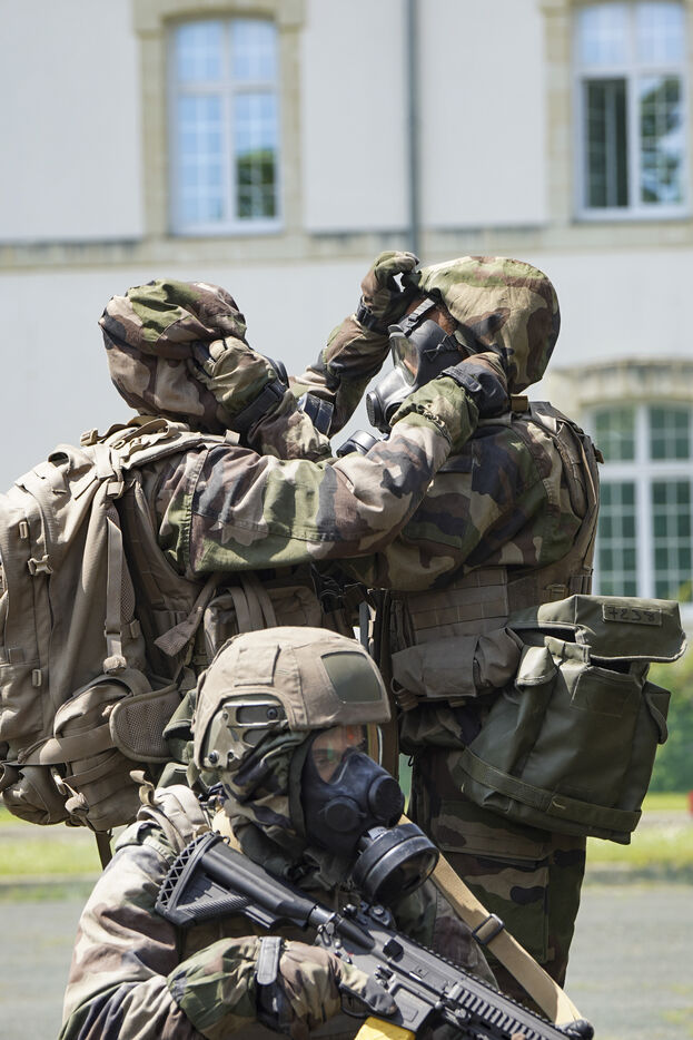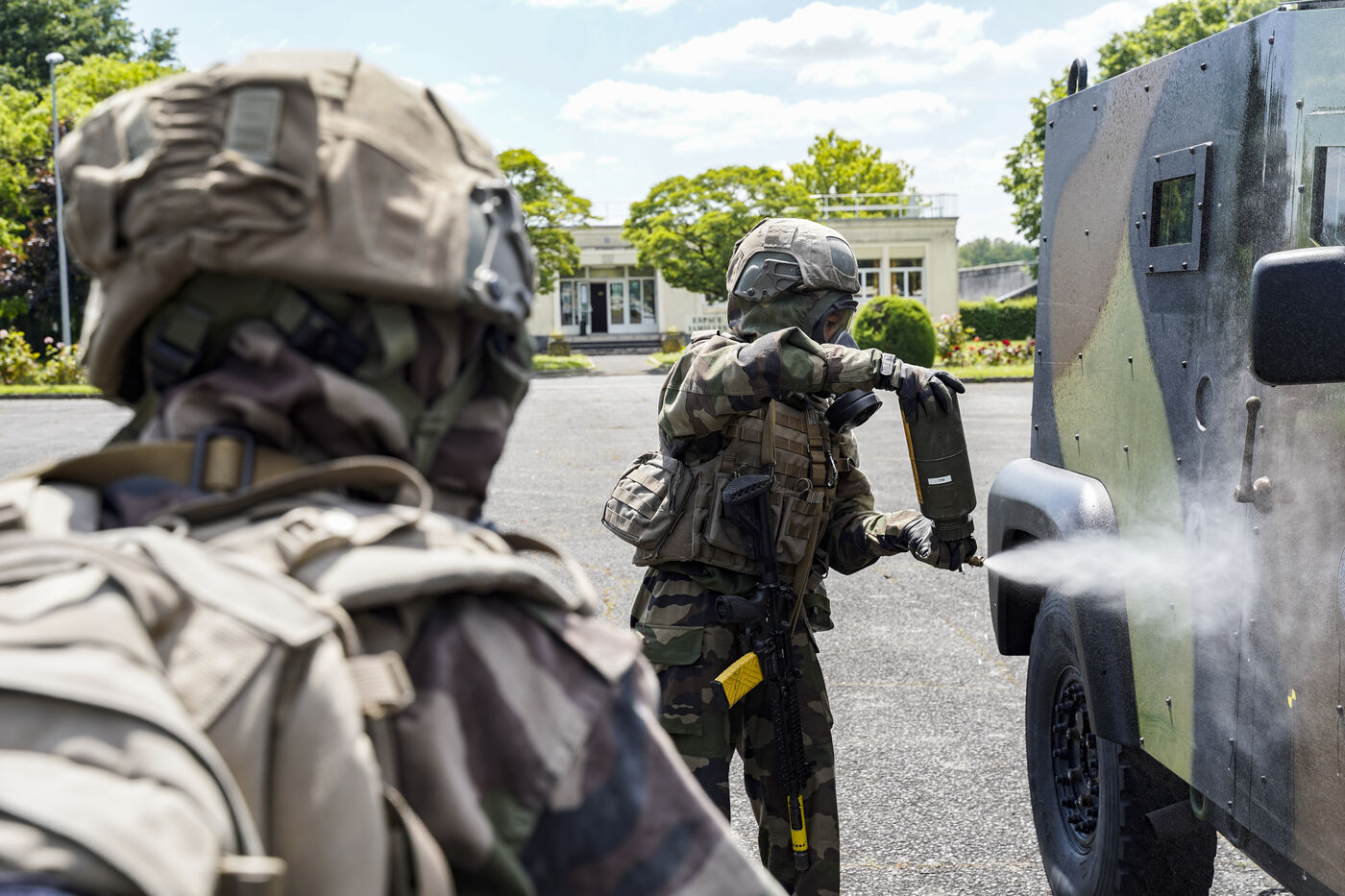 Specialists in dealing with nuclear, radiological, biological and chemical (NRBC) threats, the soldiers of the 2nd Dragoon Regiment are training for their future deployment to the Paris 2024 Olympic Games. Equipped with gas masks and waterproof suits, they are organising a decontamination chain for personnel and vehicles.