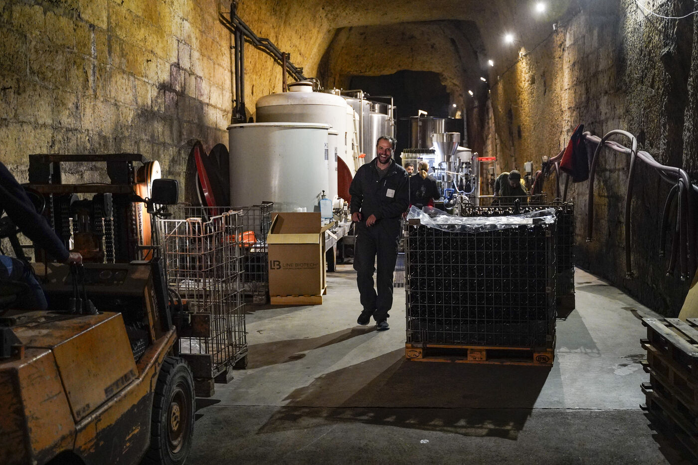 Prestataire auprès de plusieurs vignerons indépendants du Val de Loire, Davy est embouteilleur depuis plus d’une vingtaine d’années. Ce matin, c’est 60 hectolitres de vin de Saumur-Champigny, du millésime 2023, qu’il met en bouteille à la propriété d'un viticulteur du Saumurois. Pour cela, il a placé son monobloc de tirage près des cuves à vin entreposées dans le chai situé à l'intérieur d'une cave de tuffeau. Pour ce travail, il est aidé de deux ouvriers agricoles de la propriété.