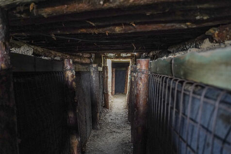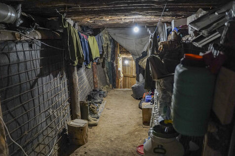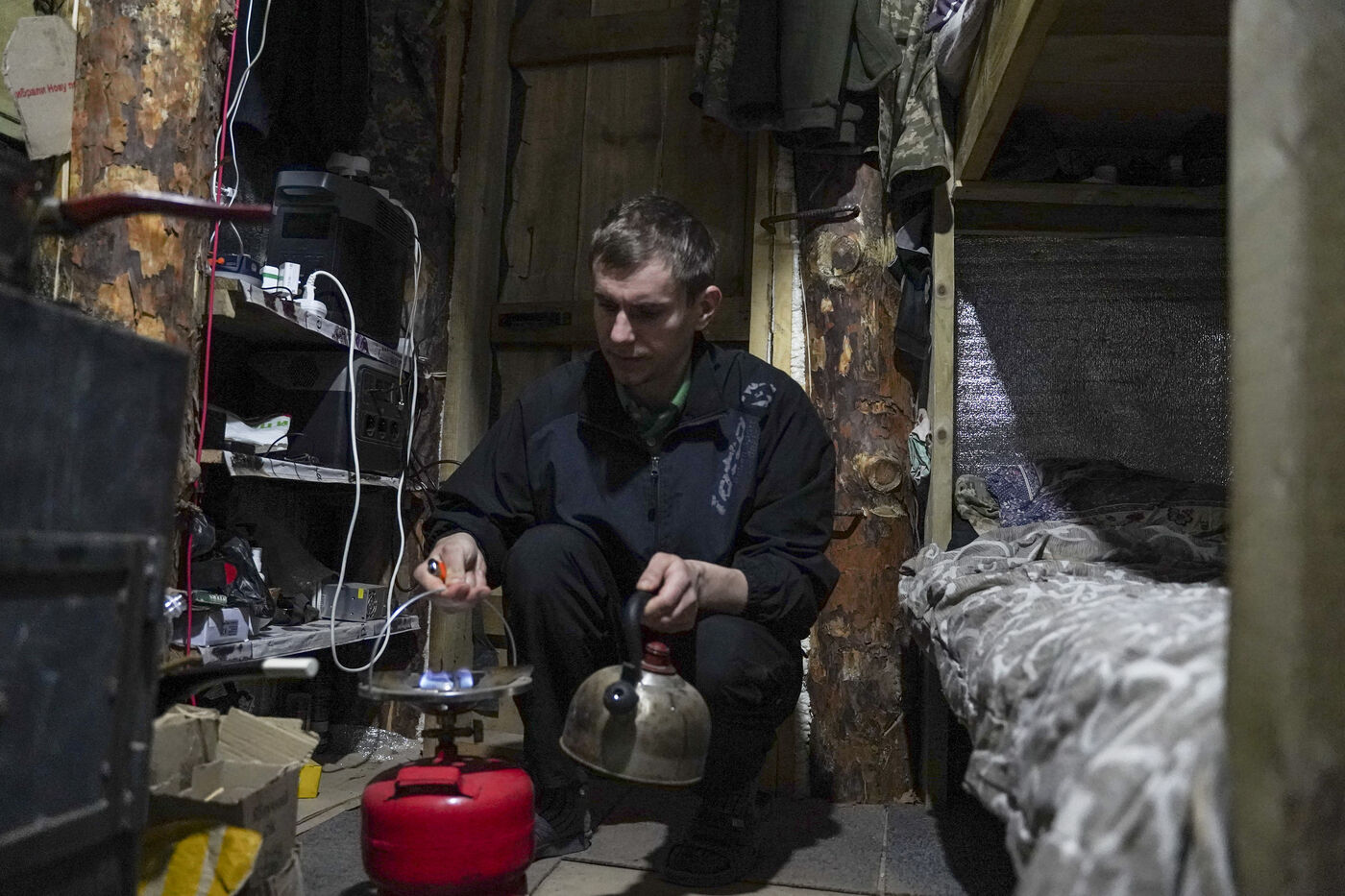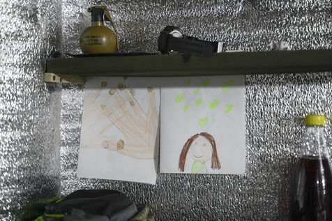 Une alerte retentit, nous voilà happés dans le dédale des tranchées. Passage devant des postes de combat, les lieux de stockage, puis les zones de vie. C’est là que je rencontre Andrey, Volodymyr, Sergey et leurs compagnons. Ils vivent par groupes de quatre dans de petites “chambres” aménagées le long des parois ; elles sont équipées de lits superposés en bois et chacun personnalise son coin. Andrey a accroché les dessins de ses enfants ; Volodymyr, le croyant, a installé un autel avec deux icônes et une bougie.