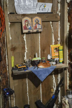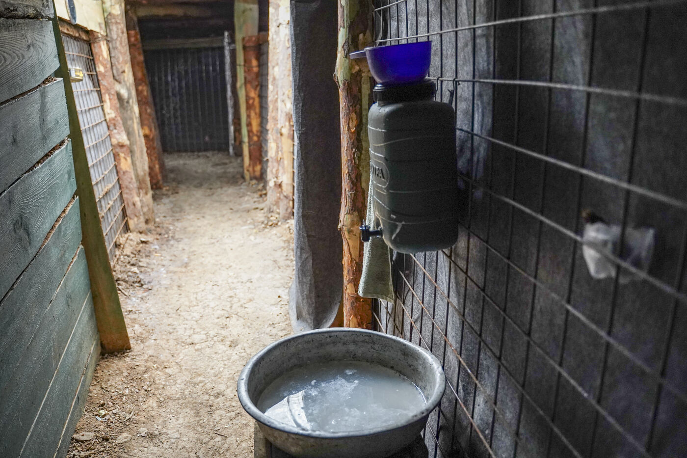 An alarm sounds and we are drawn into the maze of trenches. We pass combat posts, storage areas and living quarters. This is where I meet Andrey, Volodymyr, Sergey and their companions. They live in groups of four in small ‘rooms’ along the walls, equipped with wooden bunk beds, and each person has their own corner. Andrey has hung up his children’s drawings; Volodymyr, the ‘believer’, has set up an altar with two icons and a candle.
