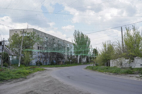 Since we can’t get to the front lines – off-limits to journalists – we head for Orikhiv. The town had 17,000 inhabitants before the war, but now has only around 500, most of them elderly, who continue to live in the ruins: everything is destroyed, but anti-drone nets have still been erected to allow the soldiers to move around as they camp discreetly in the gutted buildings.