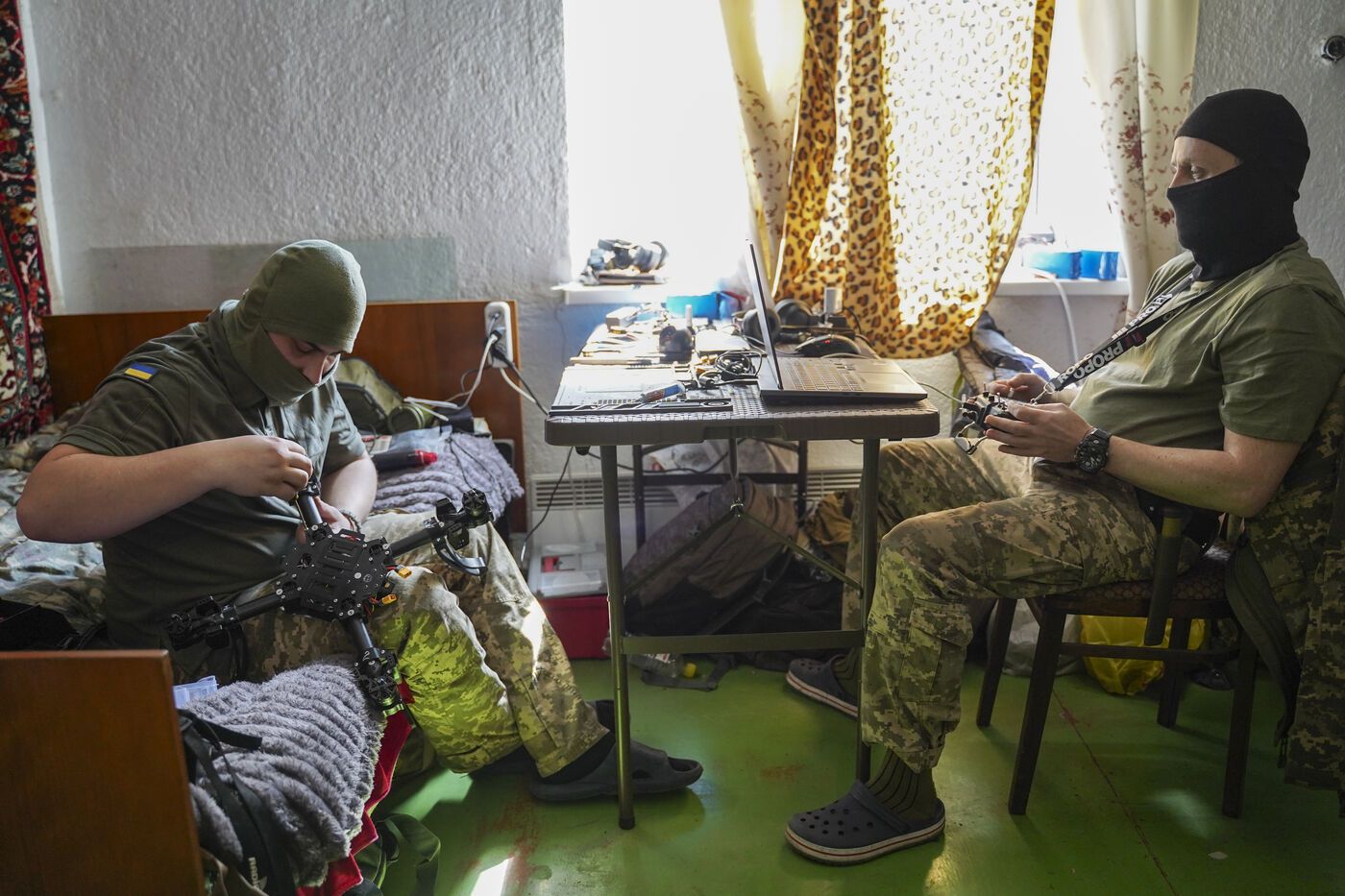 “Brother”, 59 ans, est le plus ancien et le vétéran du petit groupe. Engagé volontaire depuis juin 2022, il sera démobilisé d’office l’an prochain. Marié et père de deux fils, il avait déjà servi quatre ans dans l’armée soviétique dans les années 1980. Il confie, martial : « La patrie est derrière nous et notre mission est de la défendre. Notre état d’esprit est excellent. Comment nous plaindre alors que nous faisons notre devoir : protéger nos parents, nos enfants et nos femmes. » Mobilisé en octobre dernier, Andrey, 39 ans, ne cache pas que ses proches lui manquent : « J’ai une famille et deux enfants, j’ai vraiment envie de les revoir. La première fois que je suis allé en première ligne, c’était effrayant. Je me bats pour eux et pour ma région de Zaporijjia. » À son côté, Volodymyr, 50 ans, ingénieur forestier et père de trois filles étudiantes, s’est engagé dès le début du conflit, puis a été démobilisé pour s’occuper de sa mère âgée. Il a demandé à retourner se battre lorsque son frère, blessé, a pu prendre le relais. Sa foi le soutient, dit-il, et il prie pour les siens et la victoire de l’Ukraine. Tous profitent de cette période de retrait pour reprendre des forces, se laver, manger chaud, nettoyer leurs vêtements et entretenir leurs armes, avant d’être de nouveau engagés. Les allers-retours vers le front sont devenus une véritable épreuve périlleuse à cause des drones : « C’est épuisant. On est déposé de nuit à 4 ou 5 kilomètres de la tranchée, puis on marche en transportant tout le nécessaire pour survivre et combattre plus d’une semaine. » C’est vrai, en particulier, des équipes de dronistes de la 65e brigade. Ils doivent transporter à chaque rotation un nombre conséquent de drones FPV et de charges explosives. Deux dronistes et un artificier forment une équipe, qui est chargée d’envoyer, en moyenne, une dizaine de drones d’attaque par jour contre lesRusses. Cet armement est préparé dans des maisons transformées en atelier de montage et d’entraînement. « Il nous faut quarante minutes pour monter un drone civil et le militariser », témoigne l’un d’entre eux. Pour le pilotage, ils s’entraînent sur simulateur. « Tout se fait à l’intérieur de la maison pour ne pas se faire repérer et subir une attaque », précise le chef d’équipe.