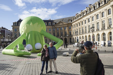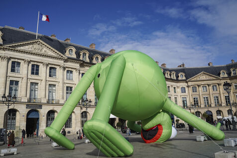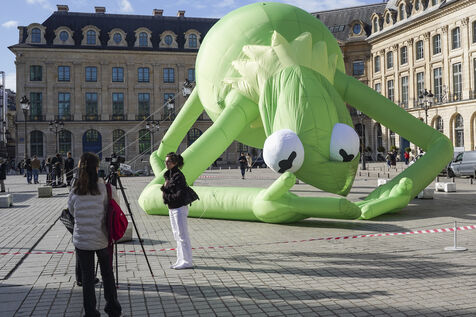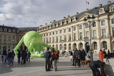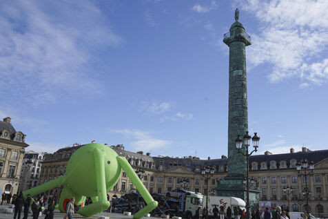 The inflatable sculpture Kermit the Frog, Even by American artist Alex Da Corte, is on display in Place Vendôme, opposite the Ministry of Justice, as part of the Art Basel Paris Public Programme.