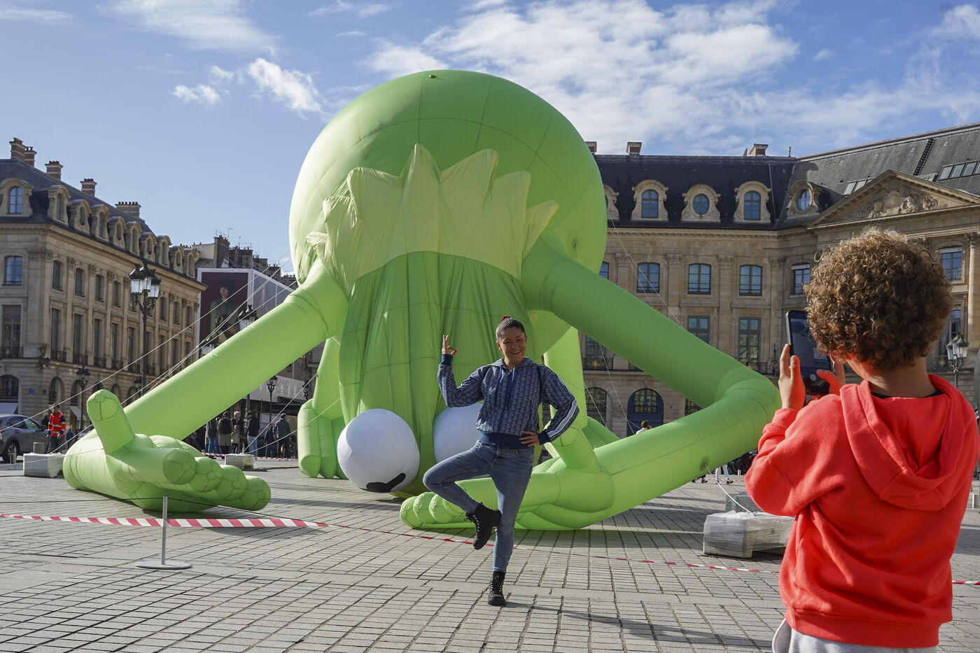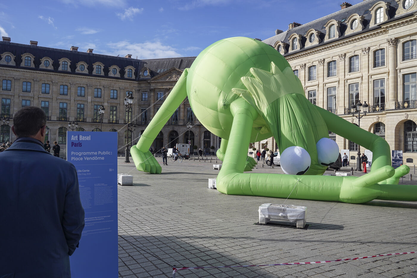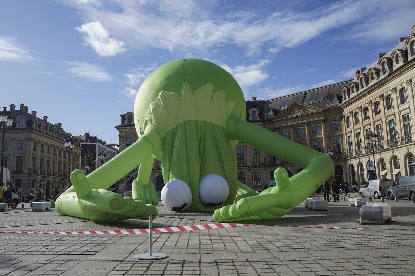 La sculpture gonflable Kermit the Frog, Even de l’artiste americain Alex Da Corte, est présentée sur la place Vendôme, face au ministère de la justice, dans le cadre du Programme Public d’Art Basel Paris.