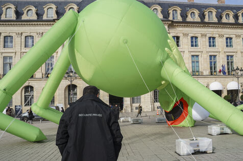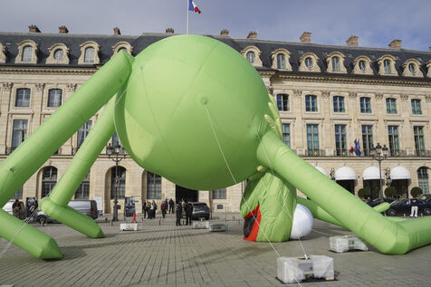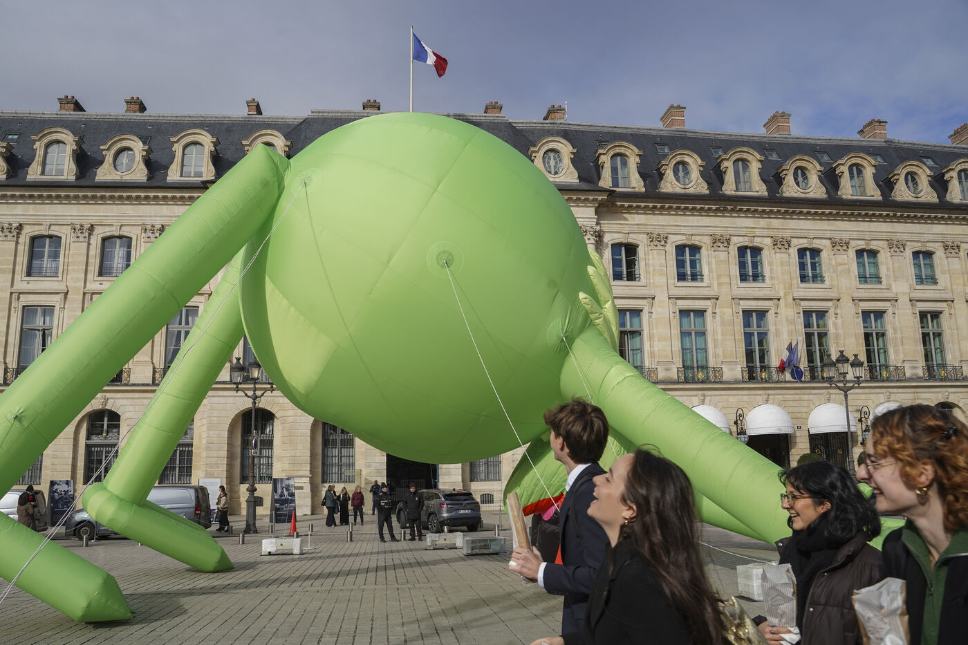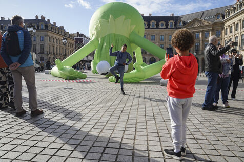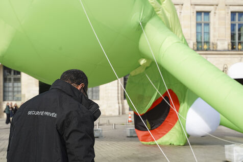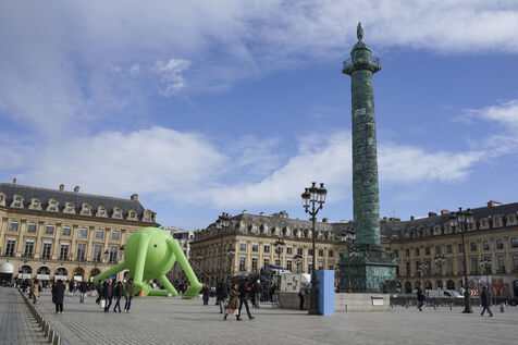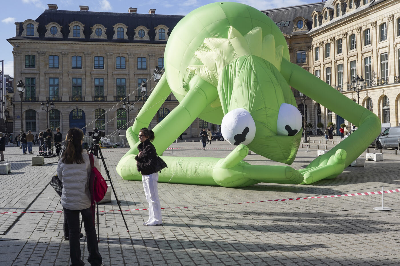 La sculpture gonflable Kermit the Frog, Even de l’artiste americain Alex Da Corte, est présentée sur la place Vendôme, face au ministère de la justice, dans le cadre du Programme Public d’Art Basel Paris.