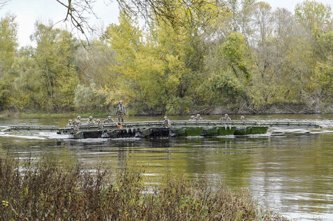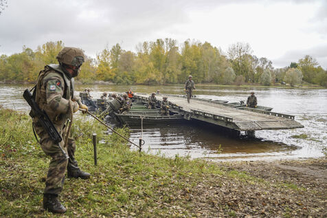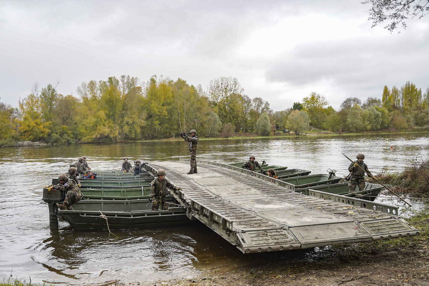 Using a light crossing device (MLF), a mobile device that can be used to quickly create a floating bridge or a crossing over water, reserve soldiers from the 6th Engineer Regiment in Angers are helping vehicles and personnel from the 9th Marine Infantry Brigade (9th BIMa) cross the Vienne River during the ‘Drogon 2025’ exercise.