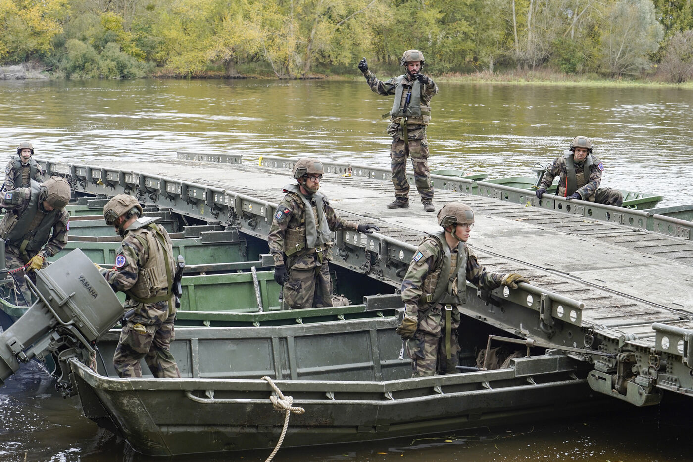 À l’aide d’un moyen léger de franchissement (MLF), dispositif mobile permettant de créer rapidement un pont flottant ou un passage sur l’eau, des militaires réservistes du 6ᵉ régiment du génie d’Angers font traverser la Vienne à des véhicules et au personnel de la 9ᵉ Brigade d’infanterie de marine (9ᵉ BIMa) lors de l’exercice « Drogon 2025 ».