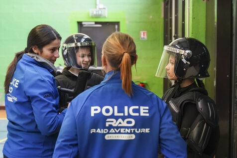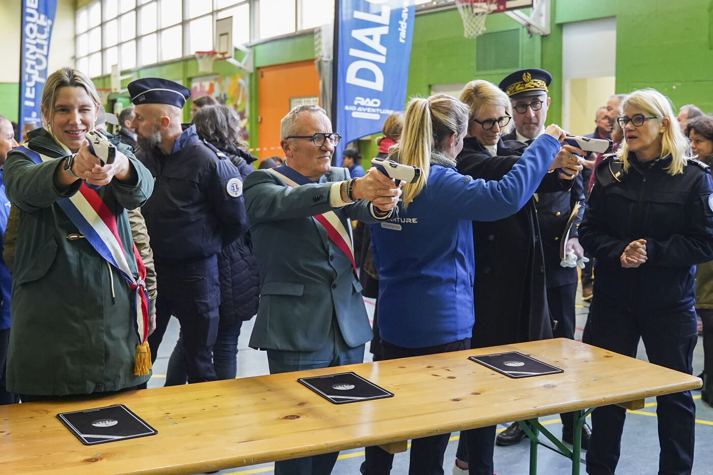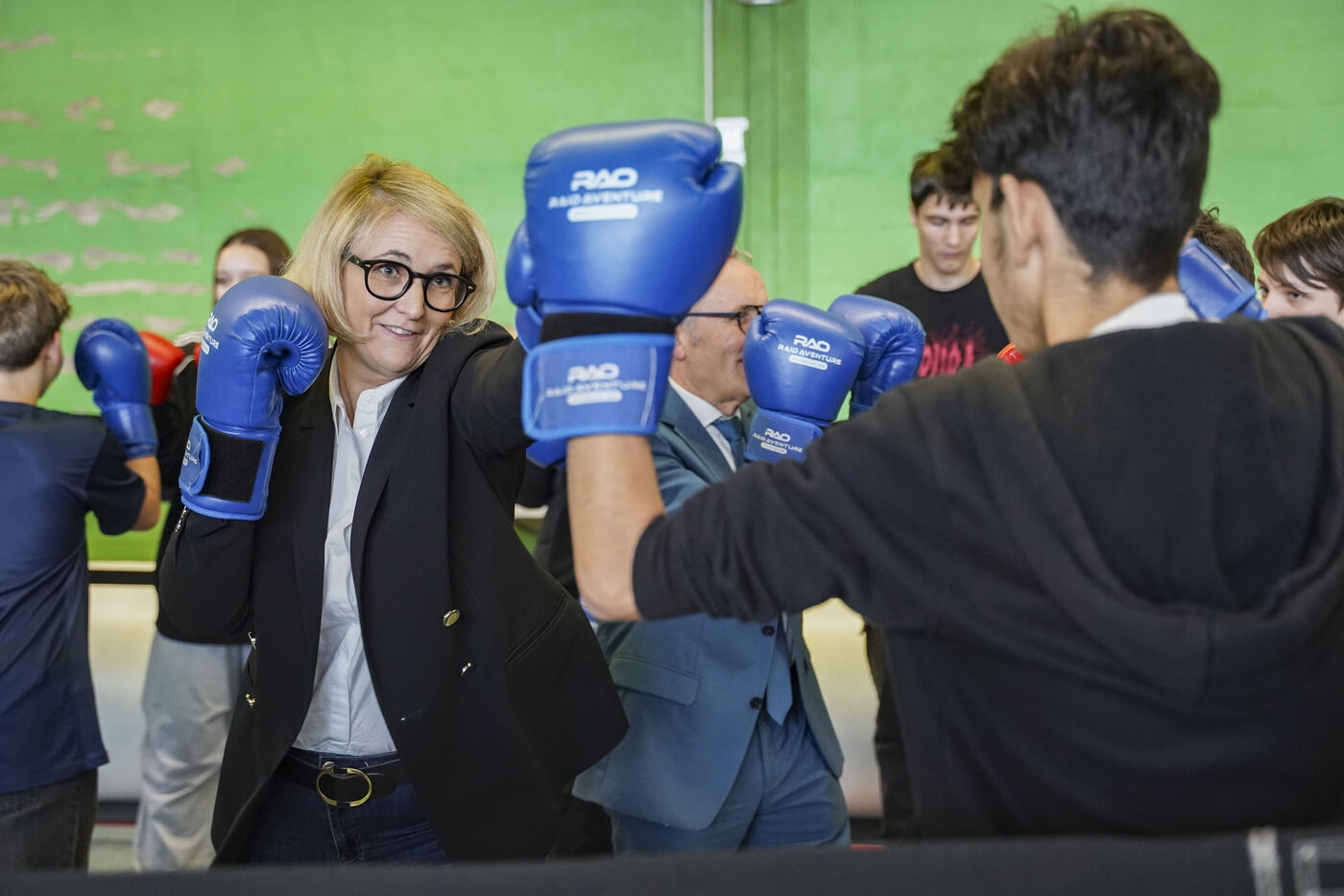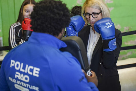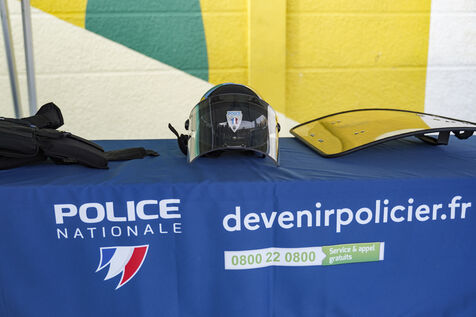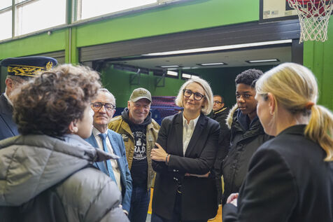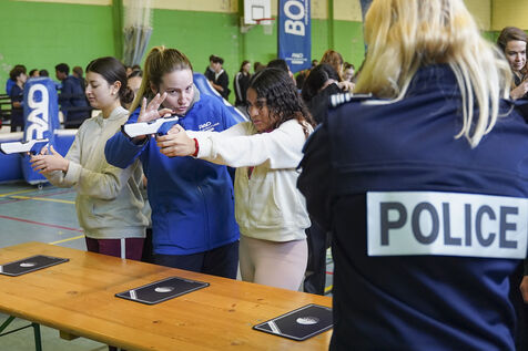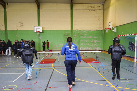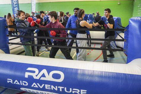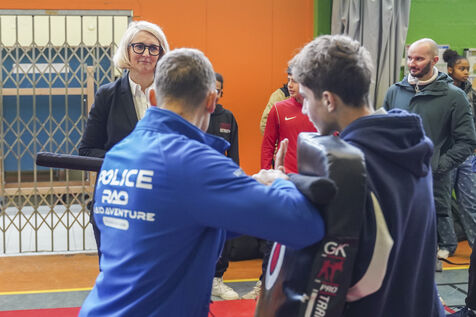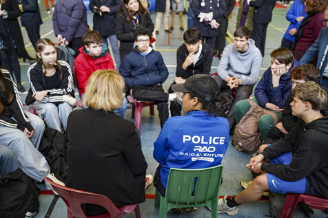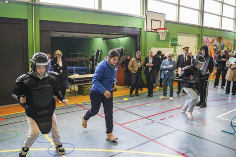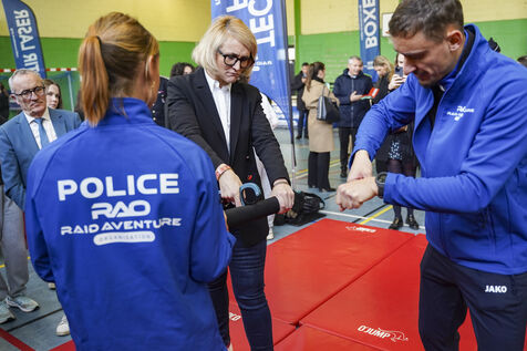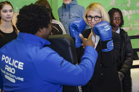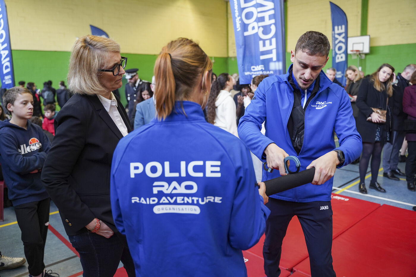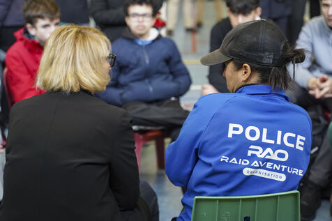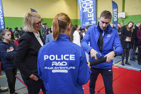 Visit by Marie-Pierre Vedrenne, Minister Delegate to the Minister of the Interior, to the Claude Gouzy Gymnasium in the Chemin Vert district of Saumur, on the occasion of the first Prox'Raid Aventures. An event organised by the association ‘Raid Aventure Organisation’ aimed at rebuilding ties between the police and the population. It was an opportunity for secondary school pupils to talk to the police and find out about their work and daily lives through workshops (laser shooting, boxing, forensic science, a space for dialogue on perceptions and experiences of the police, climbing to push oneself beyond one's limits, addiction prevention, an obstacle course in riot gear, and a first aid workshop).