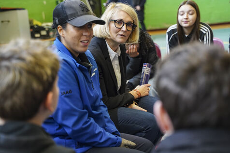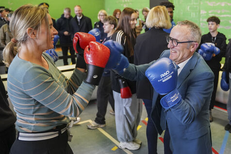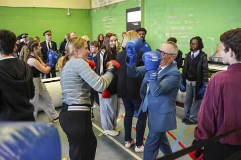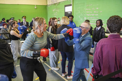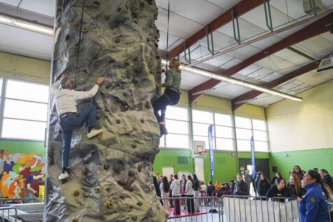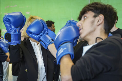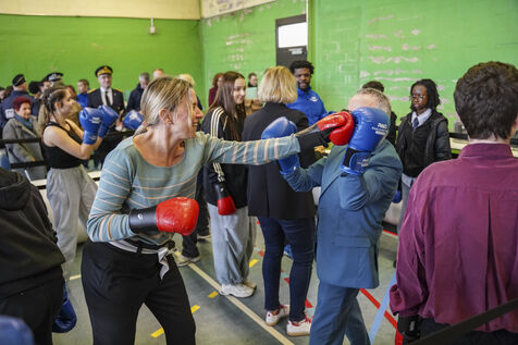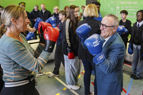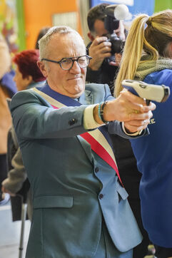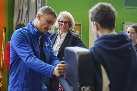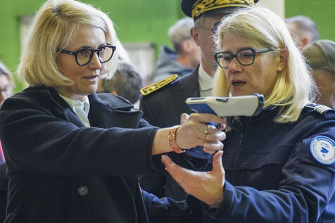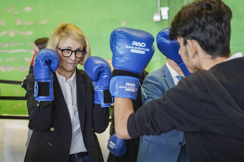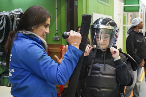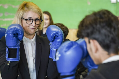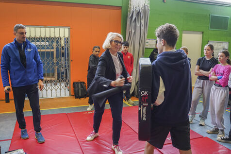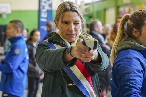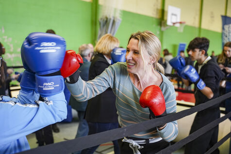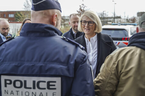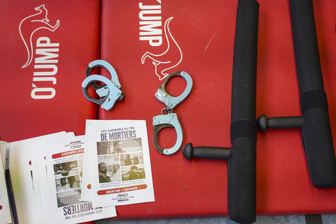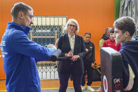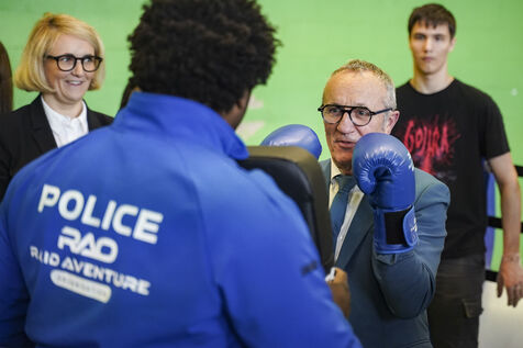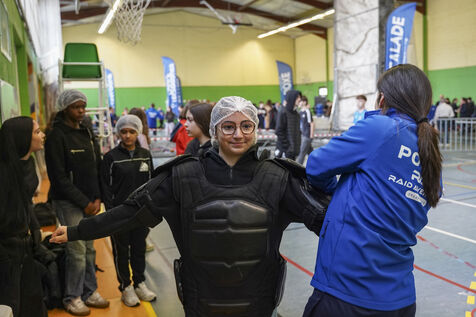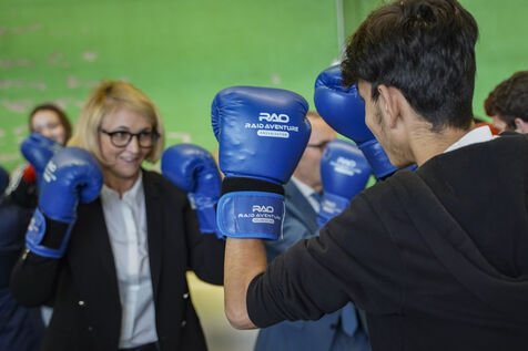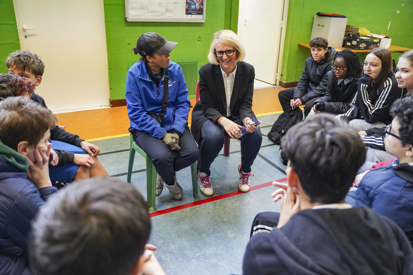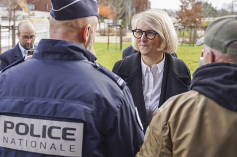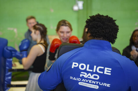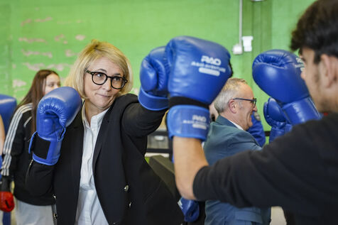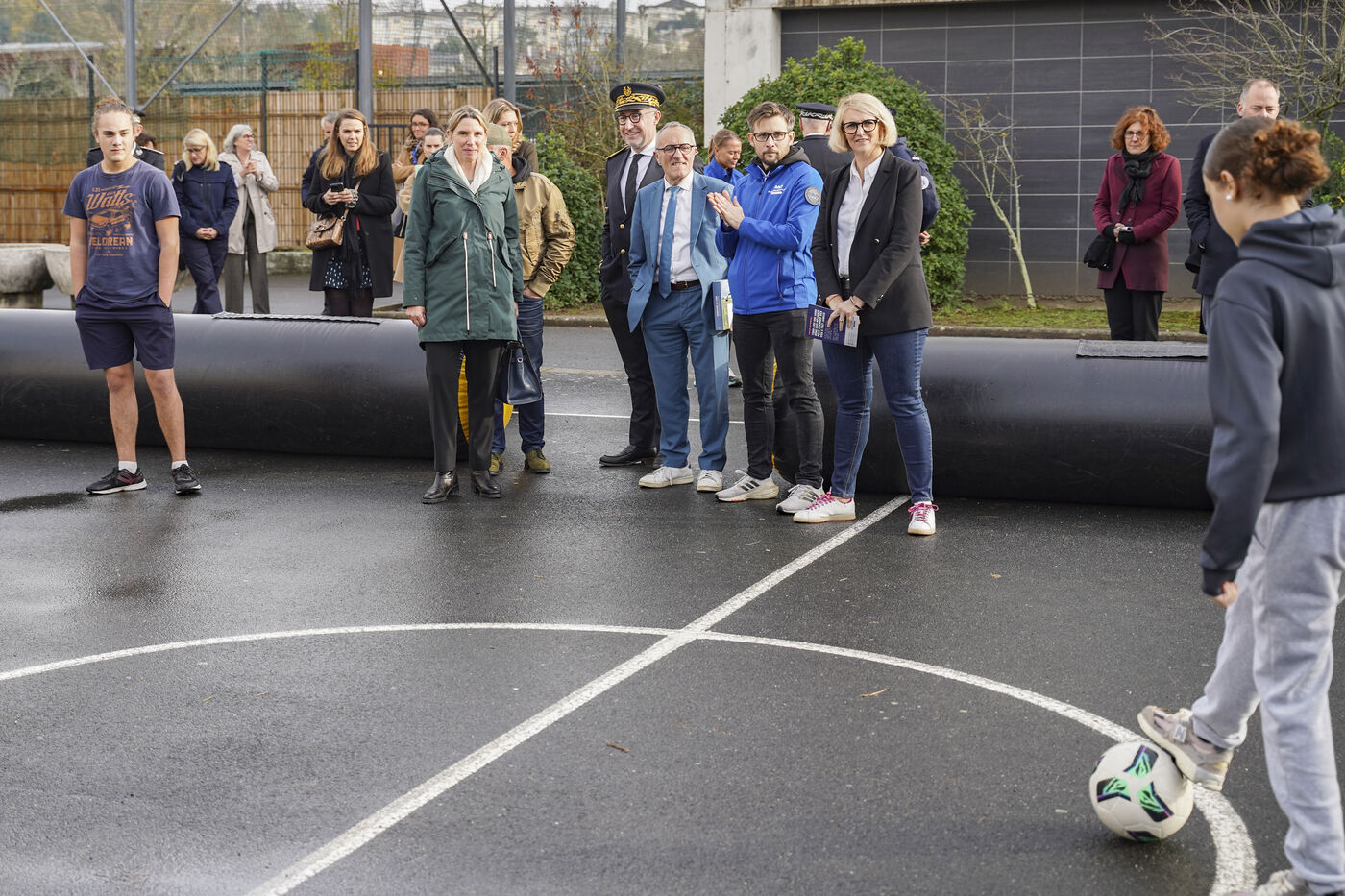 Visit by Marie-Pierre Vedrenne, Minister Delegate to the Minister of the Interior, to the Claude Gouzy Gymnasium in the Chemin Vert district of Saumur, on the occasion of the first Prox'Raid Aventures. An event organised by the association ‘Raid Aventure Organisation’ aimed at rebuilding ties between the police and the population. It was an opportunity for secondary school pupils to talk to the police and find out about their work and daily lives through workshops (laser shooting, boxing, forensic science, a space for dialogue on perceptions and experiences of the police, climbing to push oneself beyond one's limits, addiction prevention, an obstacle course in riot gear, and a first aid workshop).