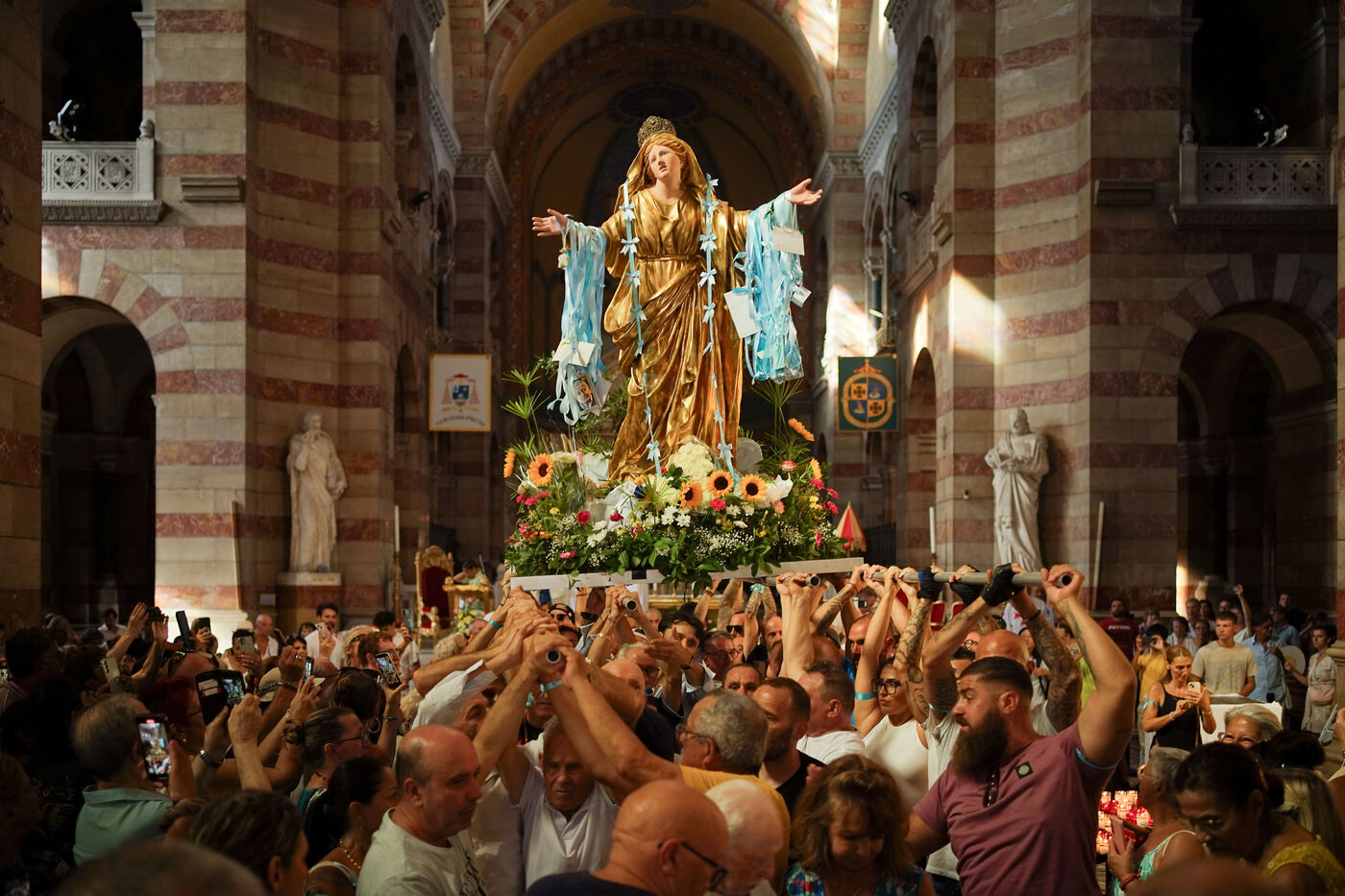 Chaque 15 août, dans le quartier du Panier à Marseille, il y a la procession de l'Assomption, une tradition populaire dont les origines remontent au début du XIXe siècle. Après la messe célébrée à la Cathédrale de la Major, la statue dorée de la Vierge Marie est portée en procession à travers les ruelles étroites du Panier. Les habitants, fidèles et visiteurs se rassemblent le long du parcours, certains offrant des mouchoirs pour effleurer le manteau de la Vierge, geste de dévotion transmis de génération en génération. Cette fête mariale, ancrée dans la tradition des habitants du Panier, est un moment de rassemblement particulièrement pour la communauté italienne et corse, anciennes communautés qui ont longtemps habité le quartier.