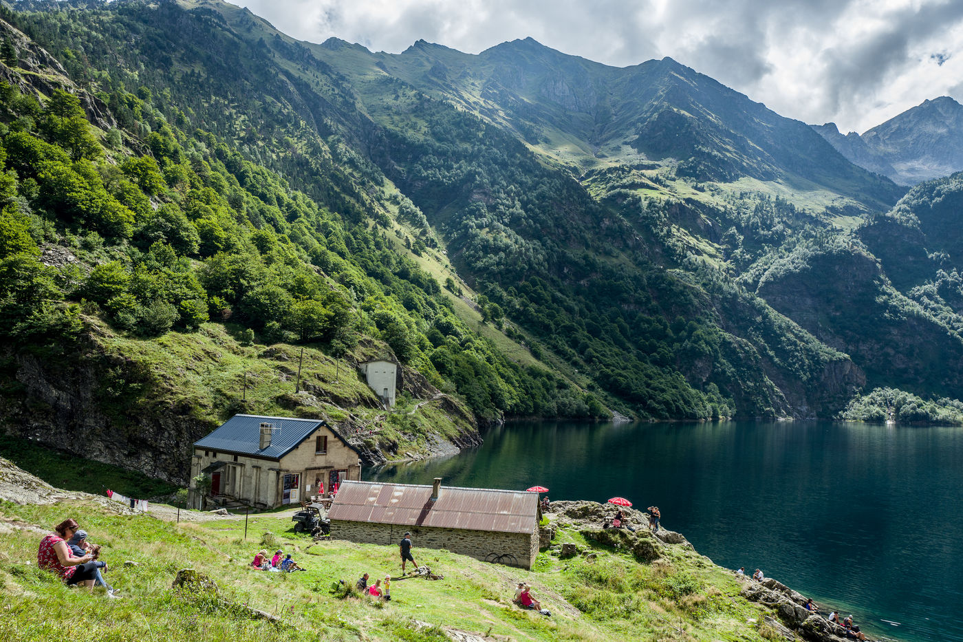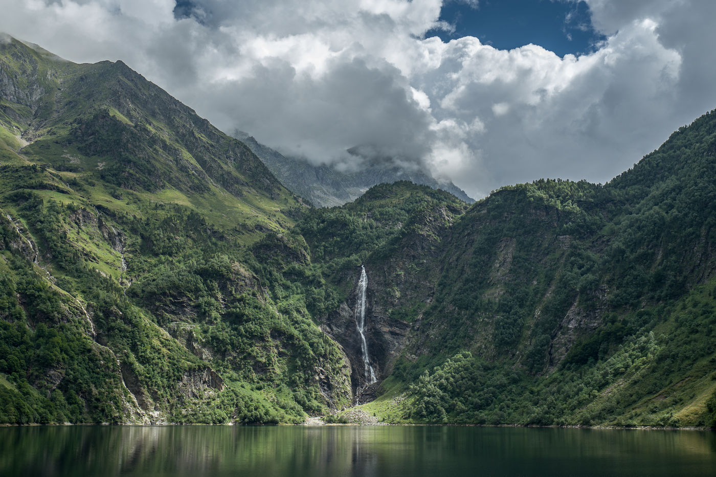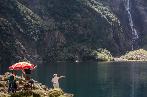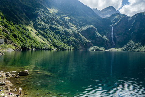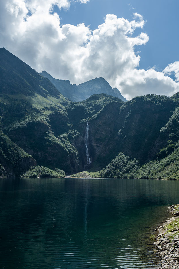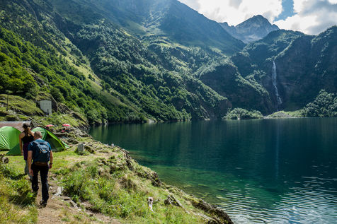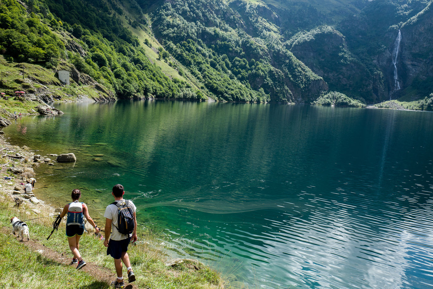 Le lac d'Oô situé à une altitude de 1 507 m est un haut lieu de balade pyrénéenne. Une des attractions est sa cascade de 275 m et le refuge auberge offre un service d'hébergement et de restauration. La montée au lac se fait par le sentier GR 10 et dure environ une heure. 28 août 2019, Oô, France. 28 août 2019, Oô, France.