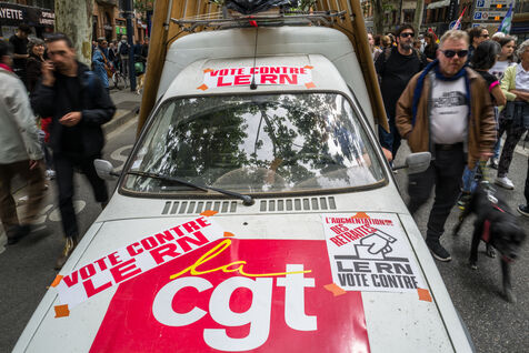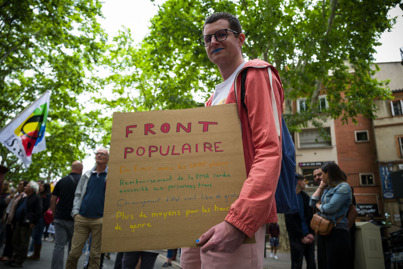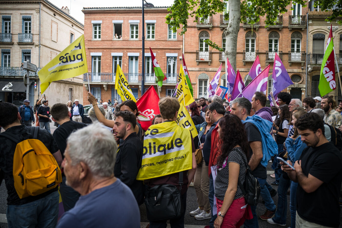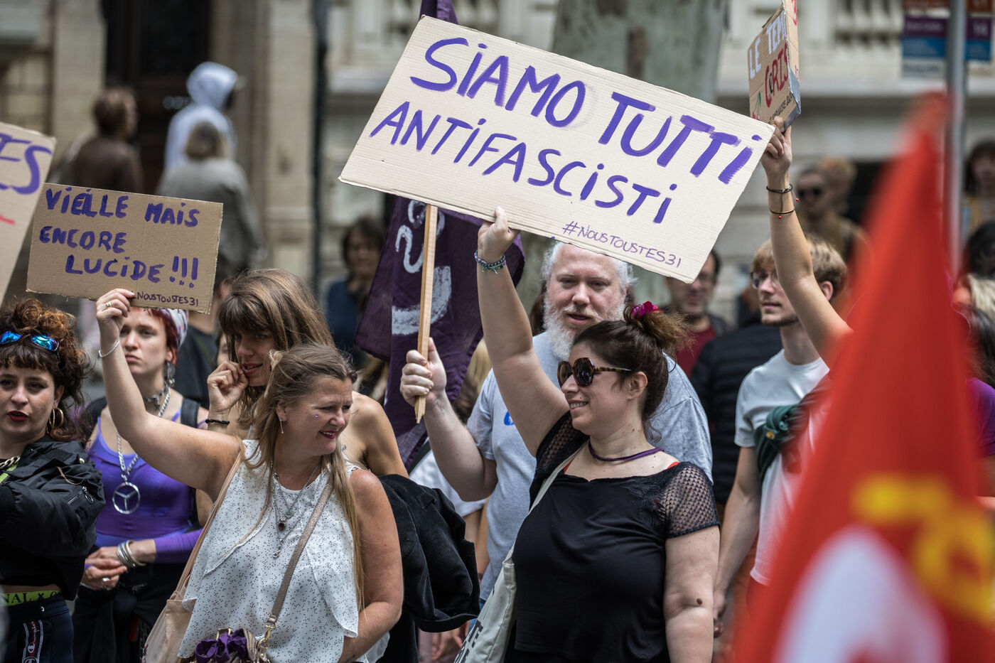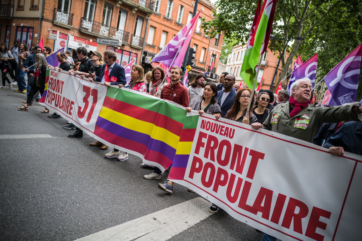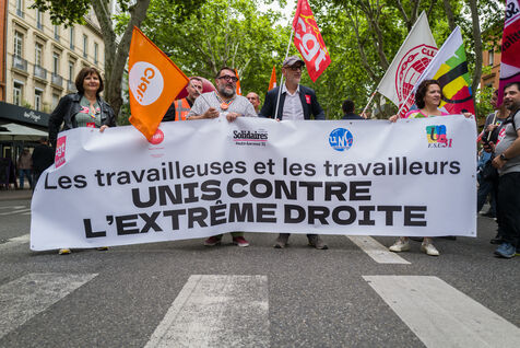 France, Toulouse, 2024-06-15. A l appel des plusieurs syndicats, mais aussi des partis politiques de gauche et d associations citoyennes de nombreuse personnes ont manifestes dans le centre ville de Toulouse contre l extreme droite et le parti politique Rassemblement National, RN, avant les elections legislatives prevues dans quelques semaines en France.