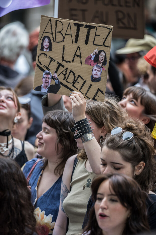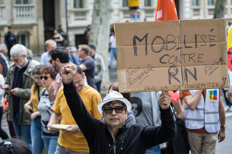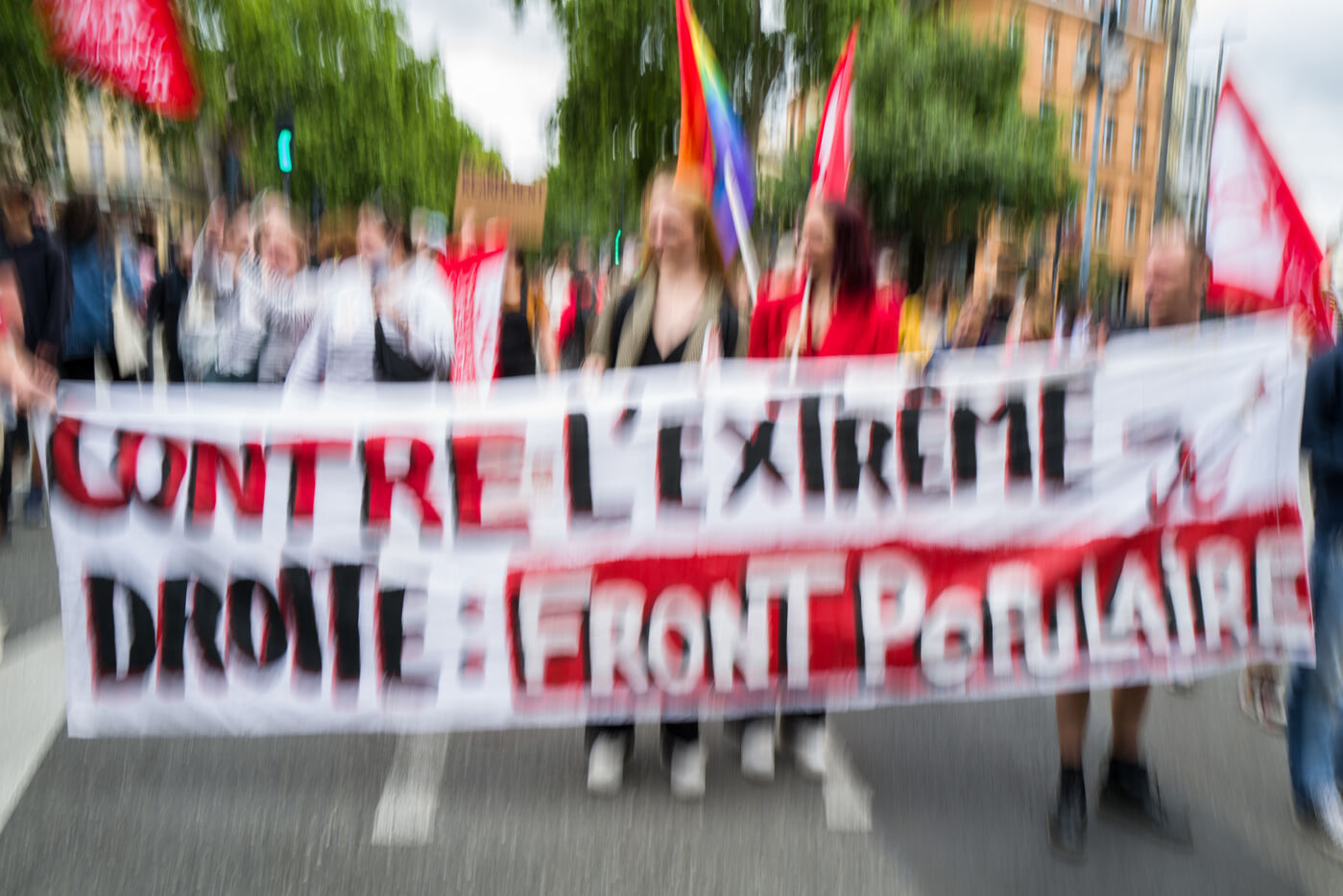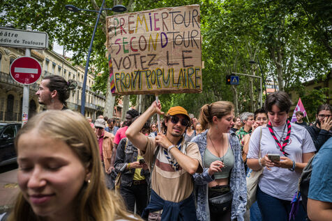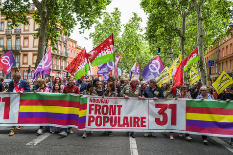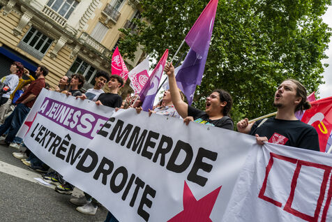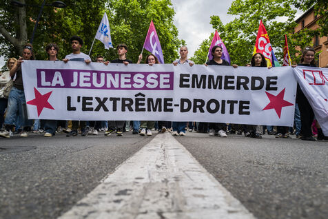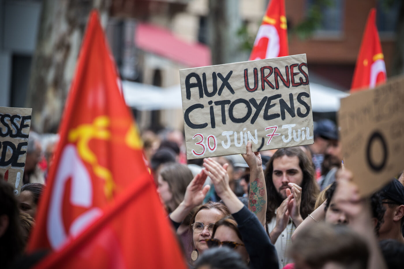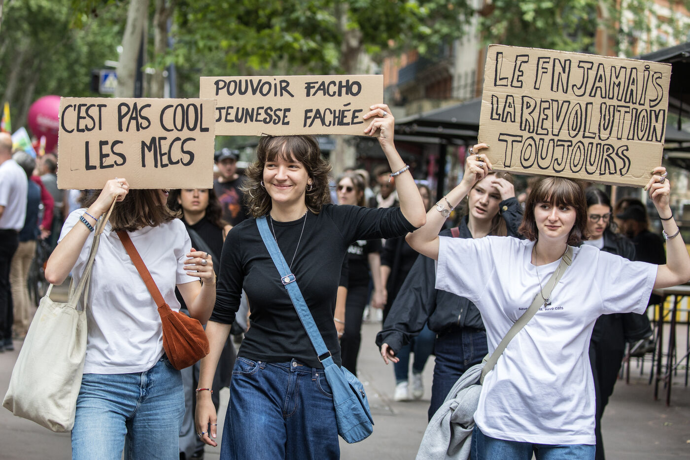 France, Toulouse, 2024-06-15. At the call of several unions, but also left-wing political parties and citizen associations, many people demonstrated in the city center of Toulouse against the extreme right and the political party Rassemblement National, RN, before the legislative elections scheduled in a few weeks In France.