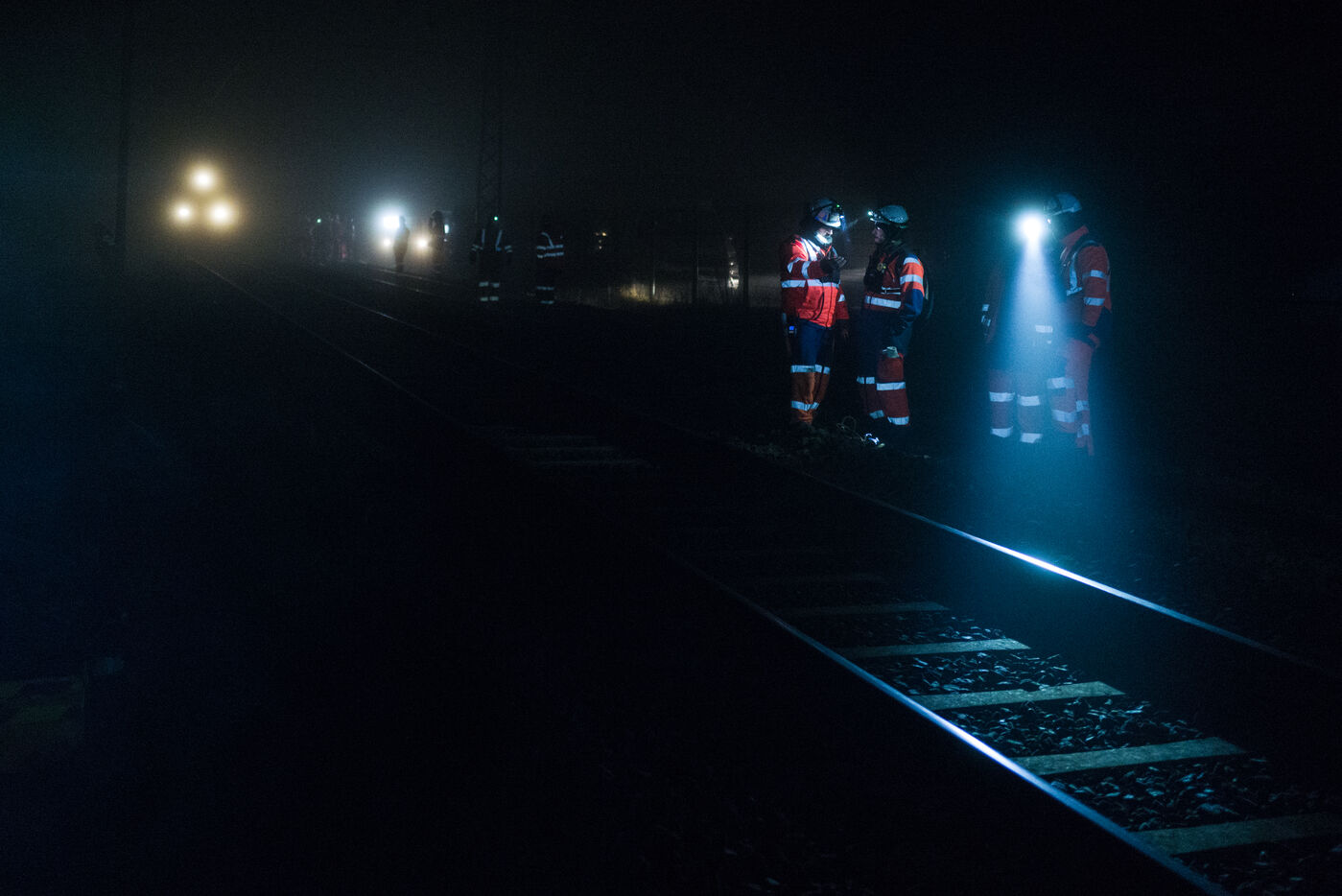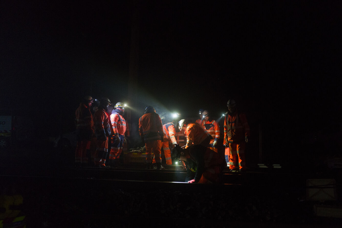 France, Baziège, 2025-01-17. Chantier de nuit de SNCF Reseau qui realise des travaux d envergure sur la voie ferre entre Toulouse et Castelnaudary dans le sud de la France avec l utilisation d un train usine appele Boa et la participation de plus de 100 agents.