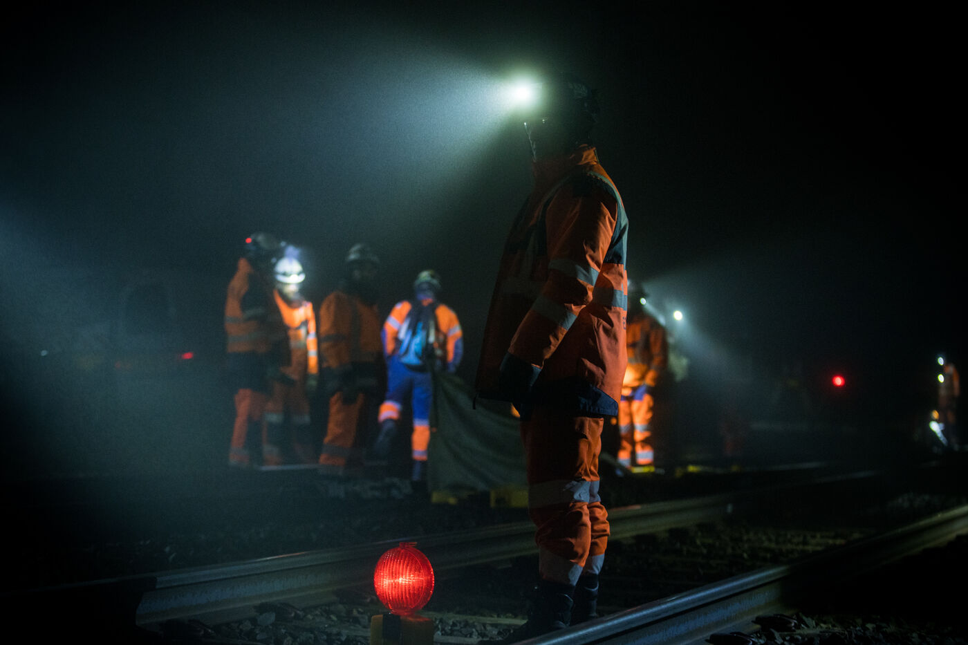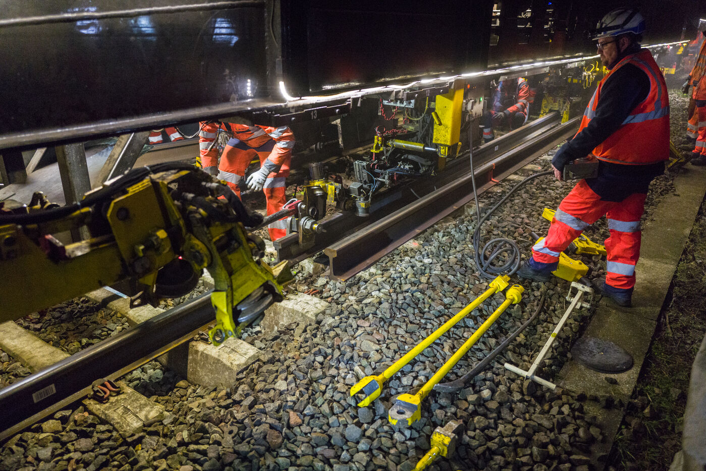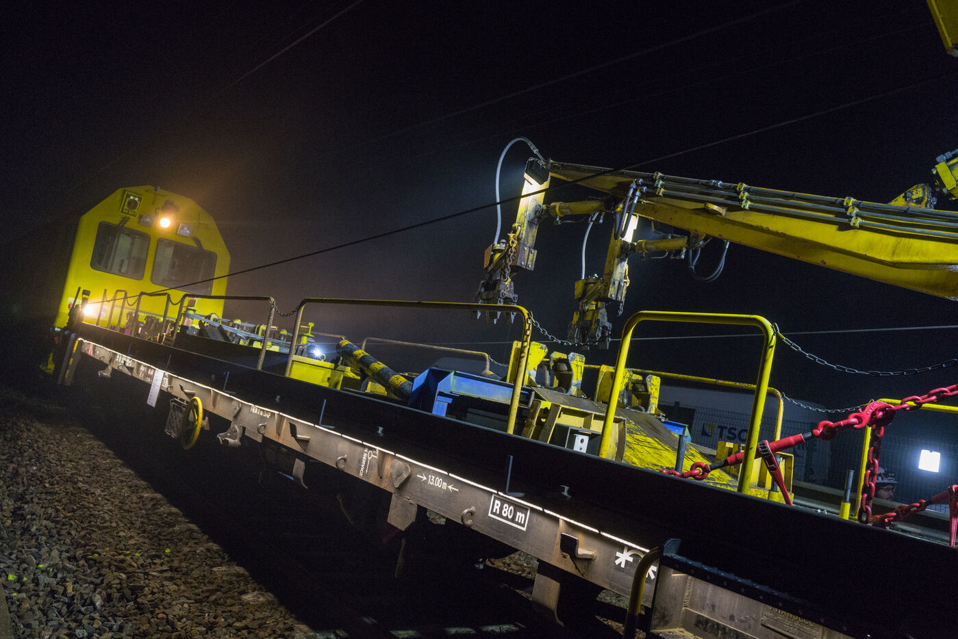 France, Baziege, 2025-01-17. SNCF Reseau is carrying out a night-time construction site on the railway between Toulouse and Castelnaudary in the south of France, using a factory train called the Boa and involving more than 100 employees.