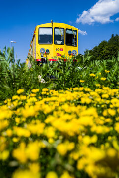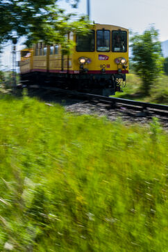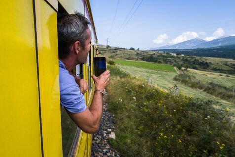 Tourists in the Yellow Train, also known as the Cerdagne line, this 62.5 km railway line in the Pyrénées-Orientales department connects Villefranche-Vernet-les-Bains station to Latour-de-Carol-Enveitg station via Font-Romeu.