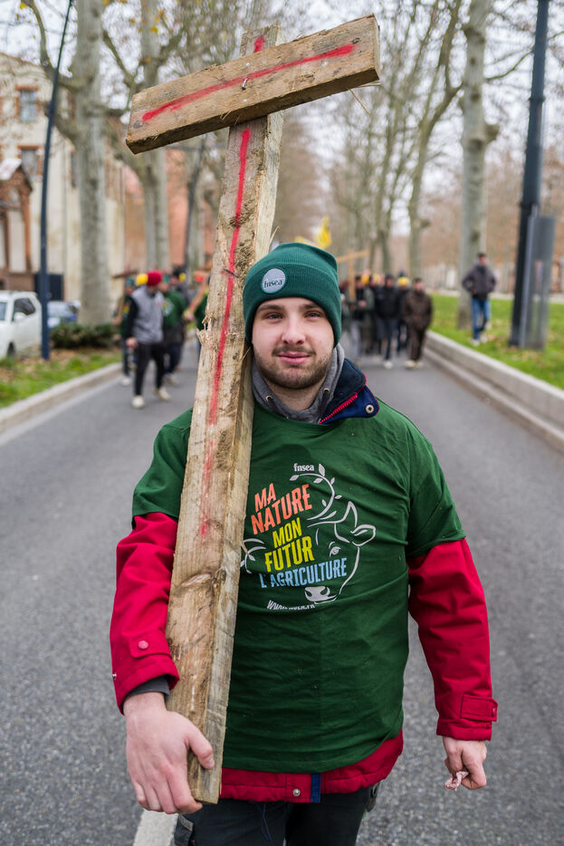 Une centaine d agriculteurs ont defile avec des croix en bois suite a l appel de l intersyndicale, FNSEA, Jeunes Agriculteurs(JA), la Coordination Rurale (CR) et la Confederation Paysanne pour denoncer la gestion par le gouvernement de l epidemie de dermatose nodulaire contagieuse, DNC qui touche les vaches de la region Occitanie et leur abattage.
