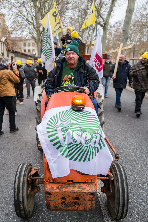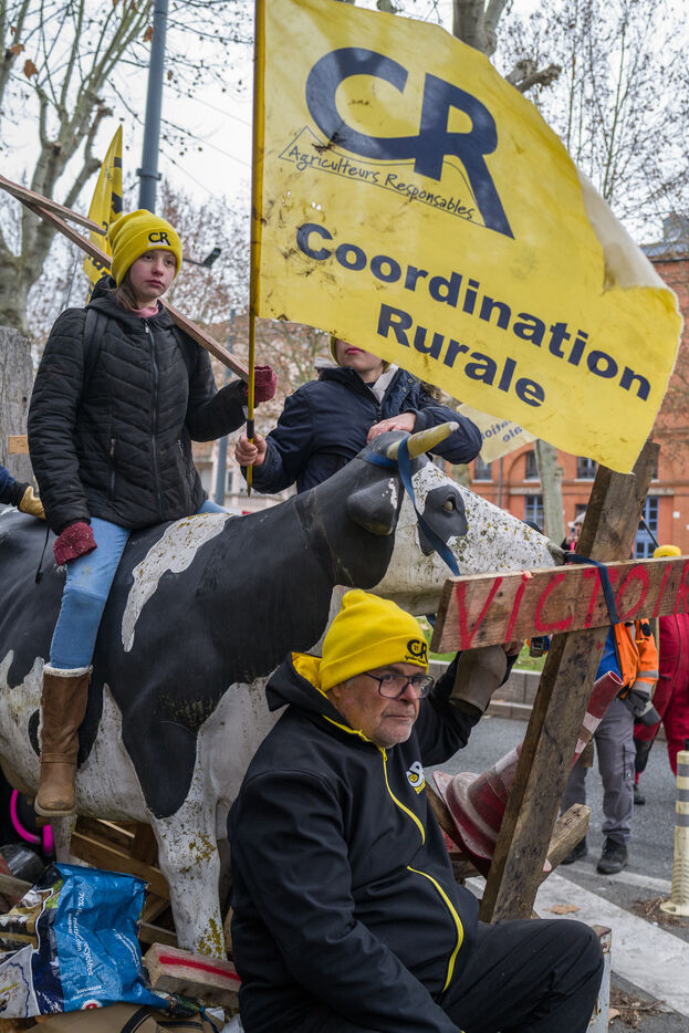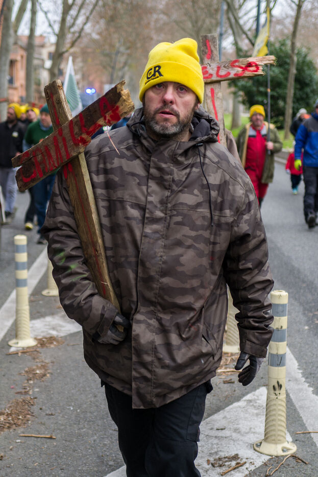 France, Toulouse, 2026-01-03. Around a hundred farmers marched with wooden crosses following a call from the inter-union group, FNSEA, Jeunes Agriculteurs (JA), Coordination Rurale (CR), and Confédération Paysanne, to denounce the government's handling of the outbreak of lumpy skin disease (LSD) affecting cows in the Occitanie region and their subsequent slaughter.