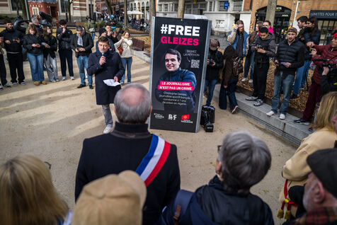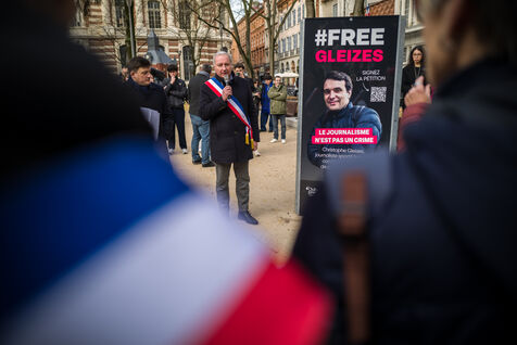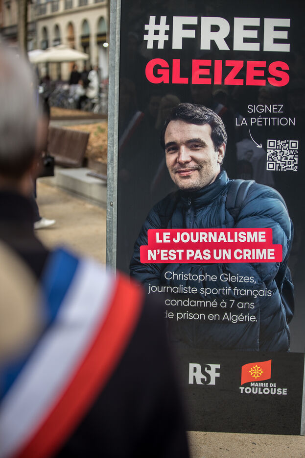 France, Toulouse, 2026-01-29. At a rally organised by the Occitanie Press Club to demand the release of sports journalist Christophe Gleyses, who has been imprisoned in Algeria for several months, the mayor of Toulouse, Jean Luc Moudenc (C) spoke to show his support.