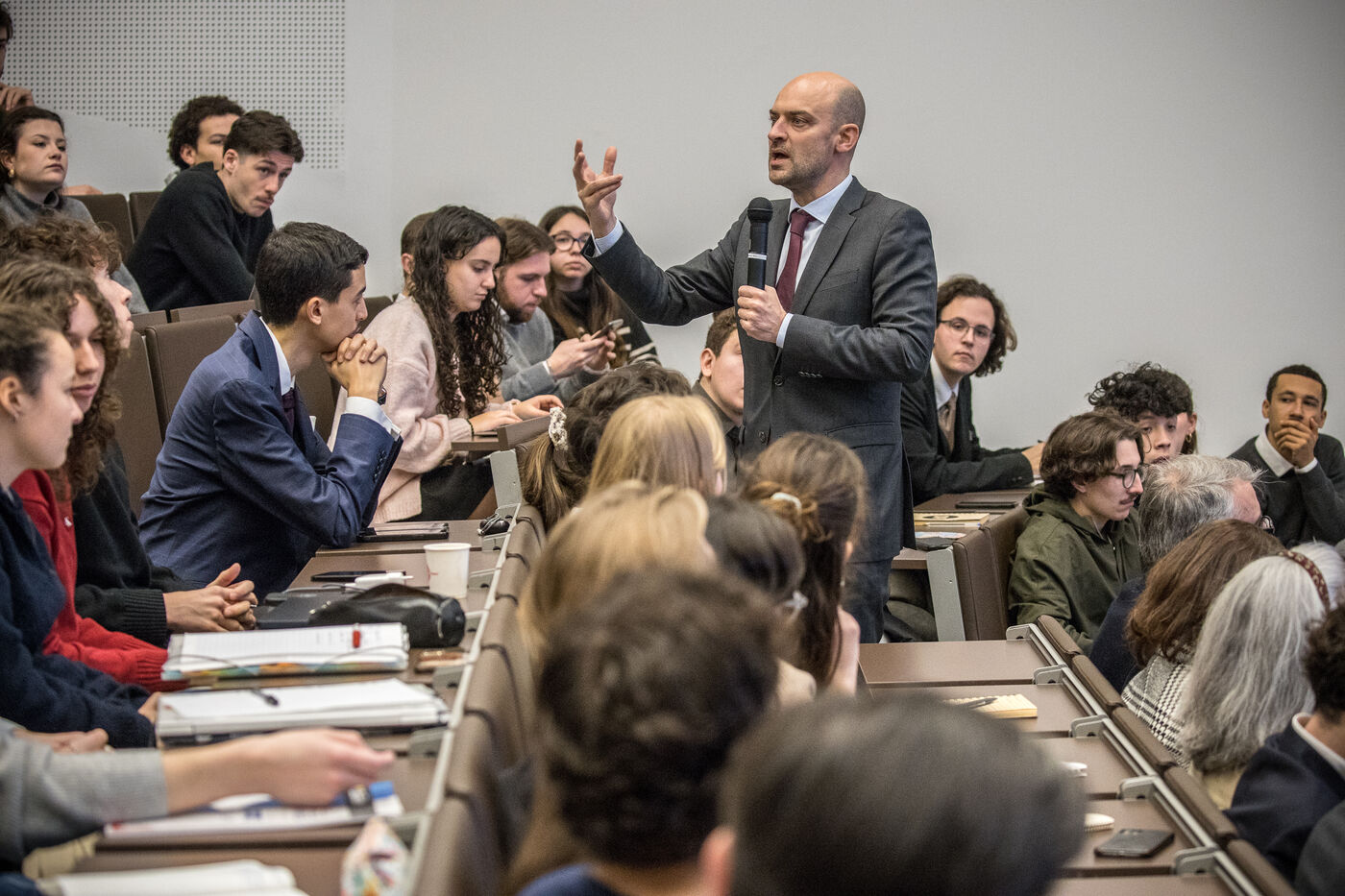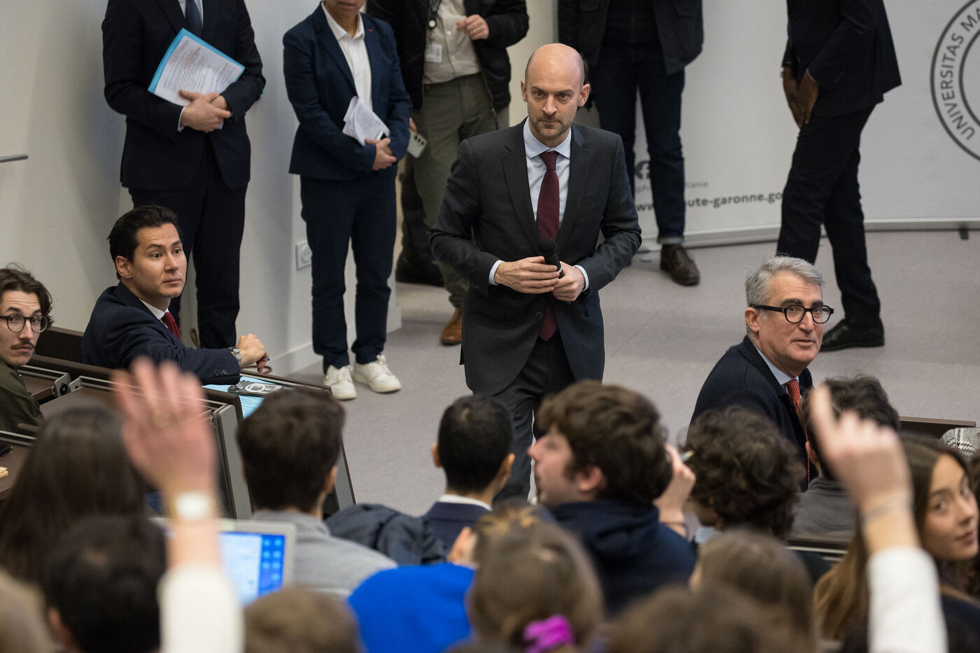 France, Toulouse, 2026-02-02. Dans le cadre de deplacements en Region sur le programme DiploNation, le ministre de l Europe et des Affaires etrangeres, Jean-Noel Barrot echange et reponds aux questions sur l actualite diplomatique avec les etudiants de l Universite Toulouse Capitole.