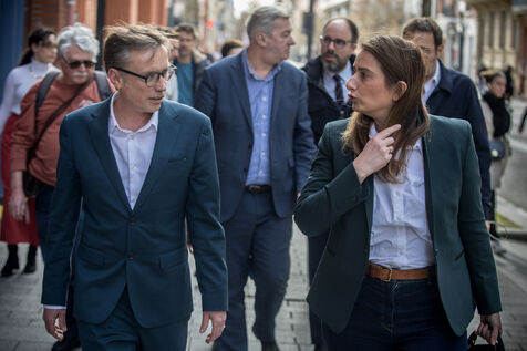 France, Toulouse, 2026-02-18. Marine Tondelier, secretaire general du parti politique des Ecologistes vient soutenir pour les prochaines elections municipales la liste La Gauche Unie pour Toulouse, autour de François Briancon du parti Socialiste et de Regis Godec avec les lunettes chef de file des ecologistes lors d une conference de presse.