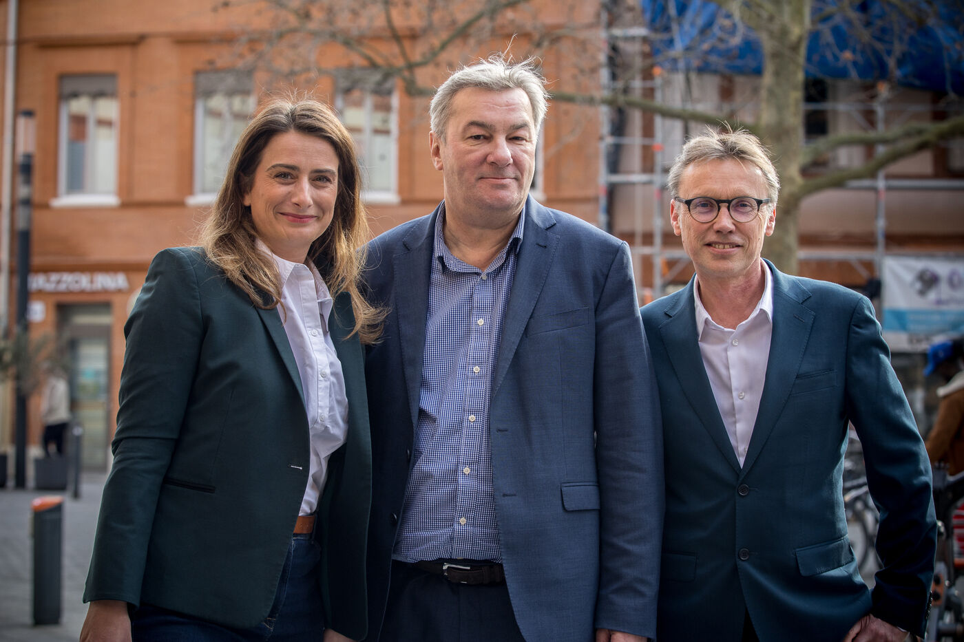 Marine Tondelier, secretary general of the Ecologists political party, shows her support for the La Gauche Unie pour Toulouse list in the upcoming municipal elections, alongside François Briançon of the Socialist Party and Regis Godec(wearing glasses), leader of the Ecologists, at a press conference.