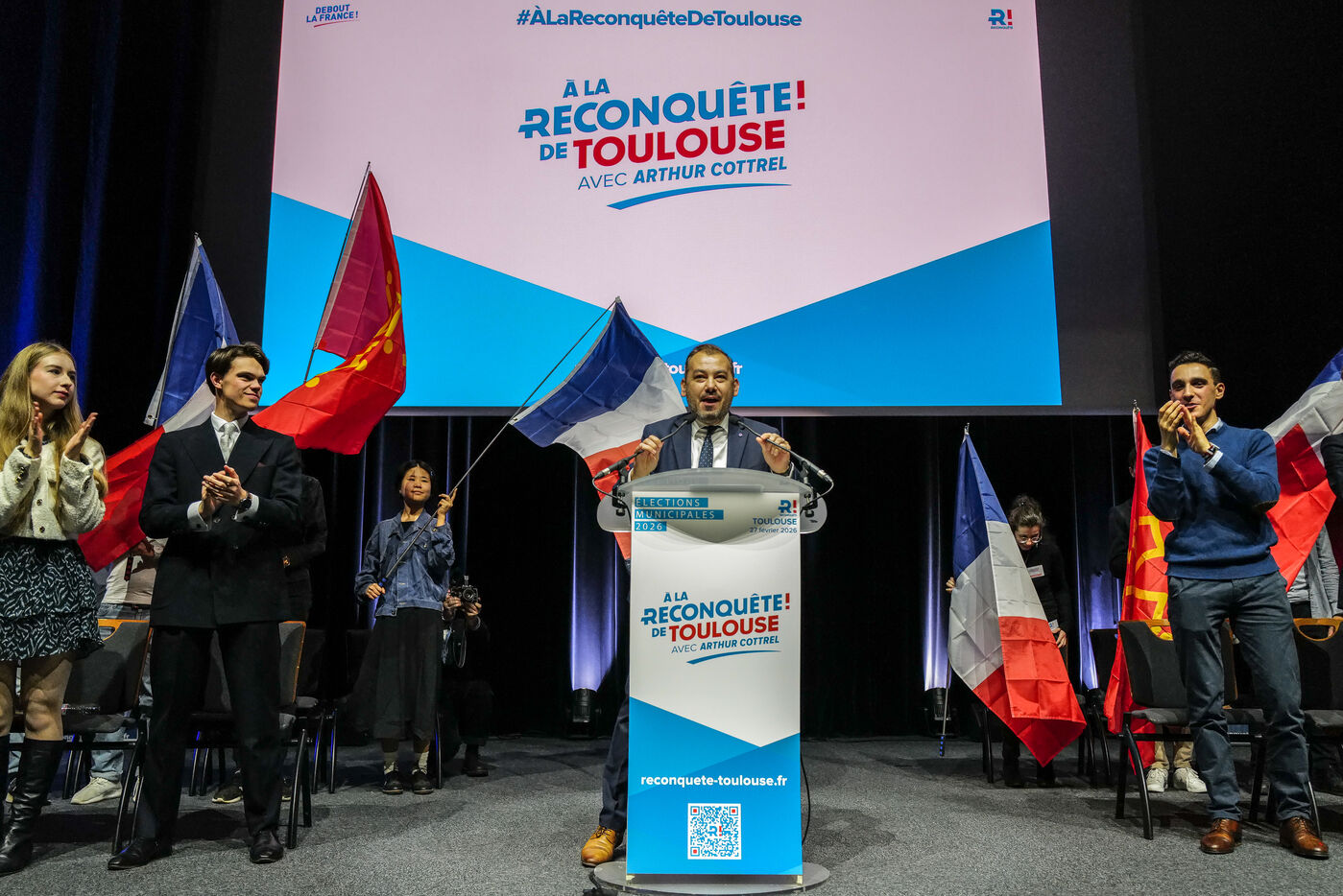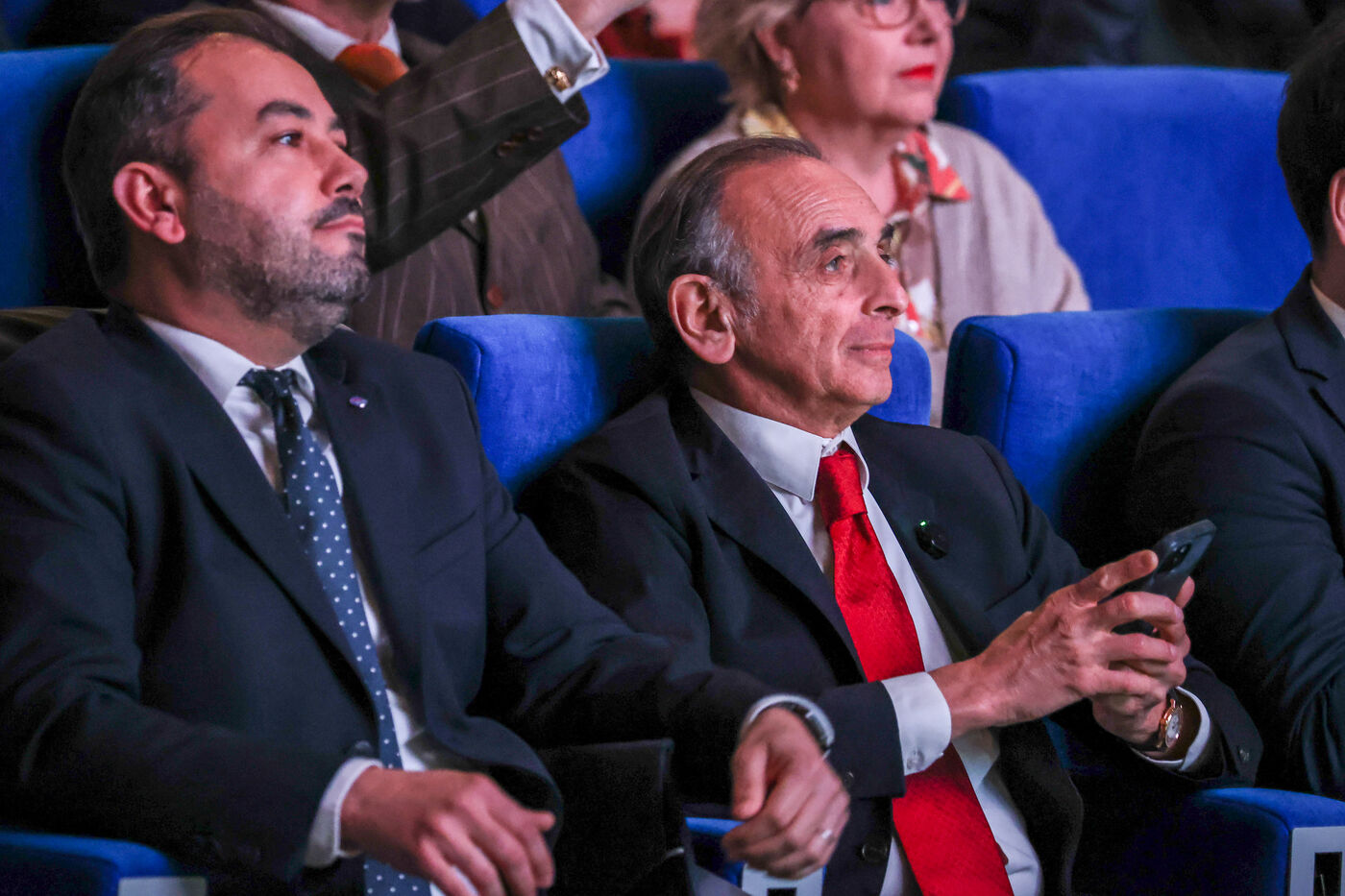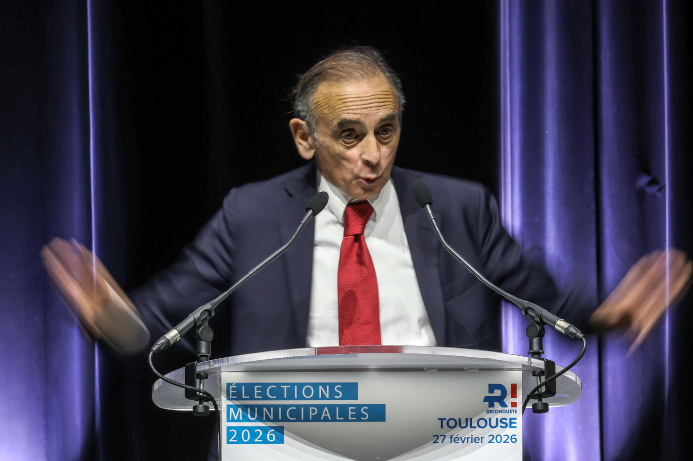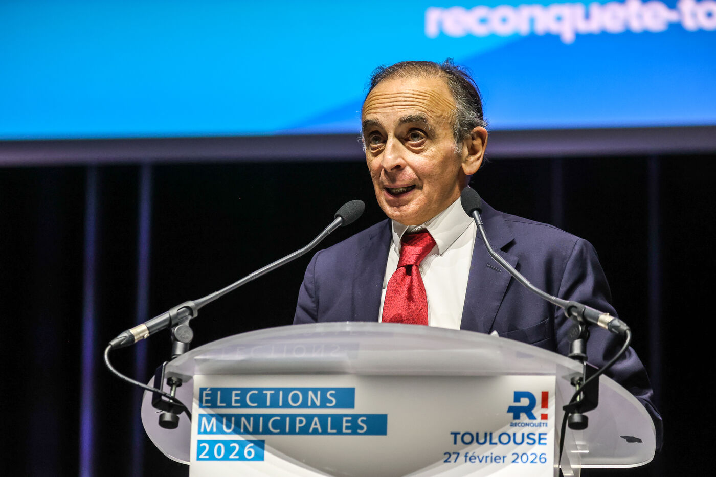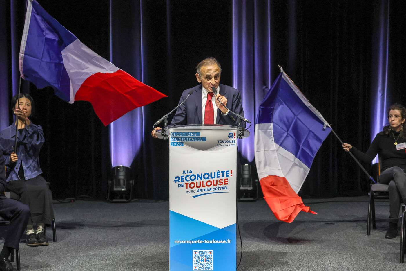France, Toulouse, 2026-02-27. Eric Zemmour, far-right journalist and polemicist, with Arthur Cottrel, candidate for the Reconquête political party in the upcoming municipal elections in Toulouse in March 2026, during a meeting at the Pierre Baudis conference centre.