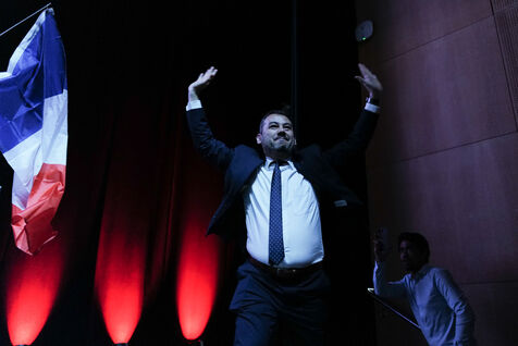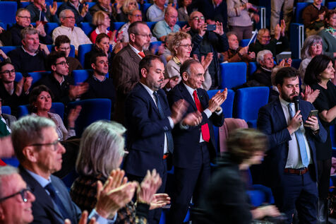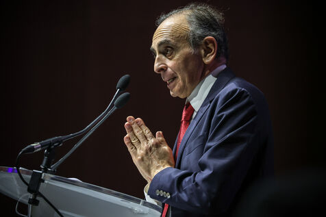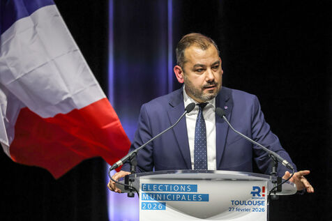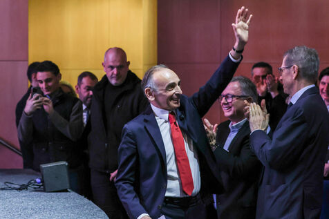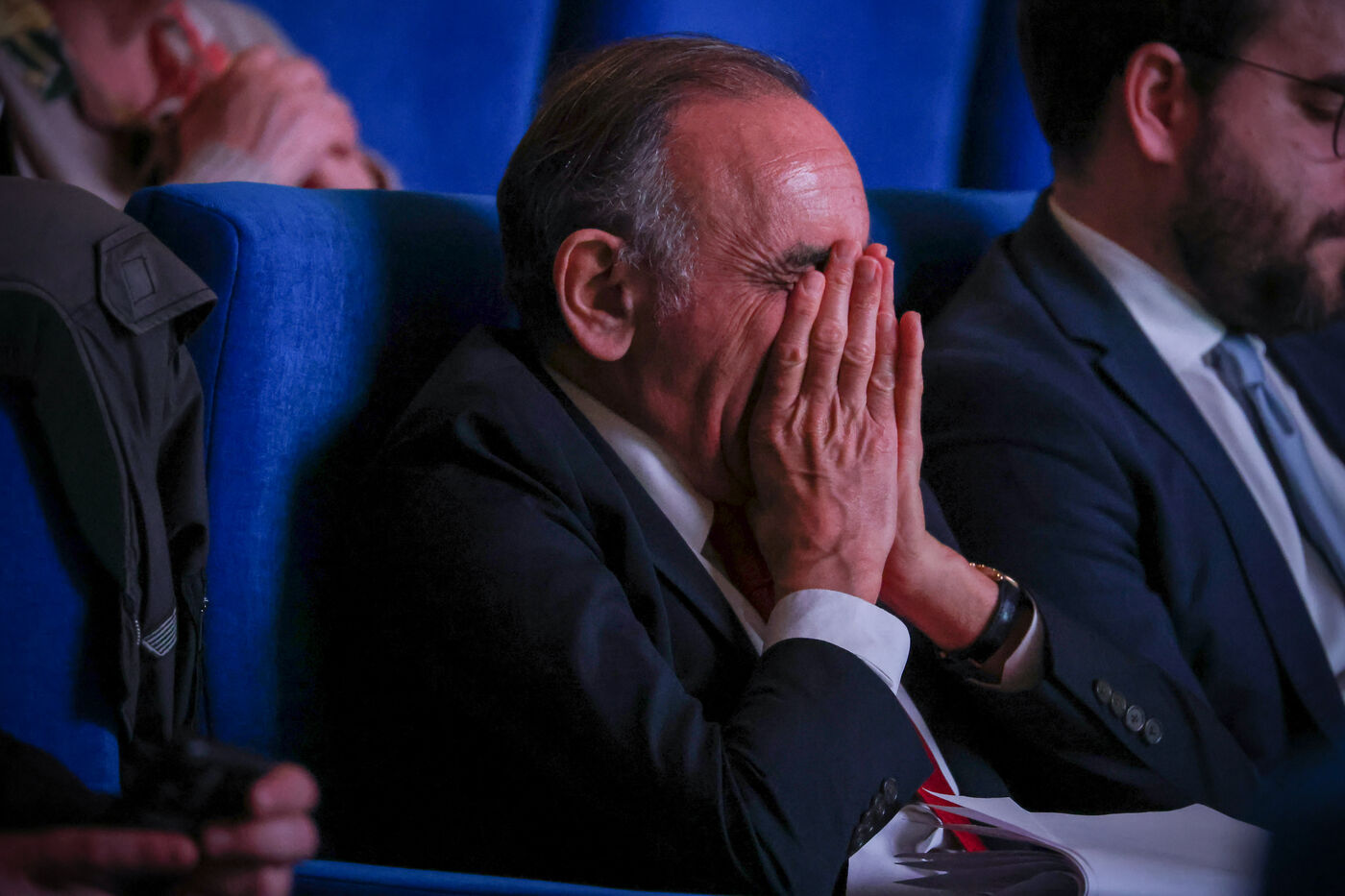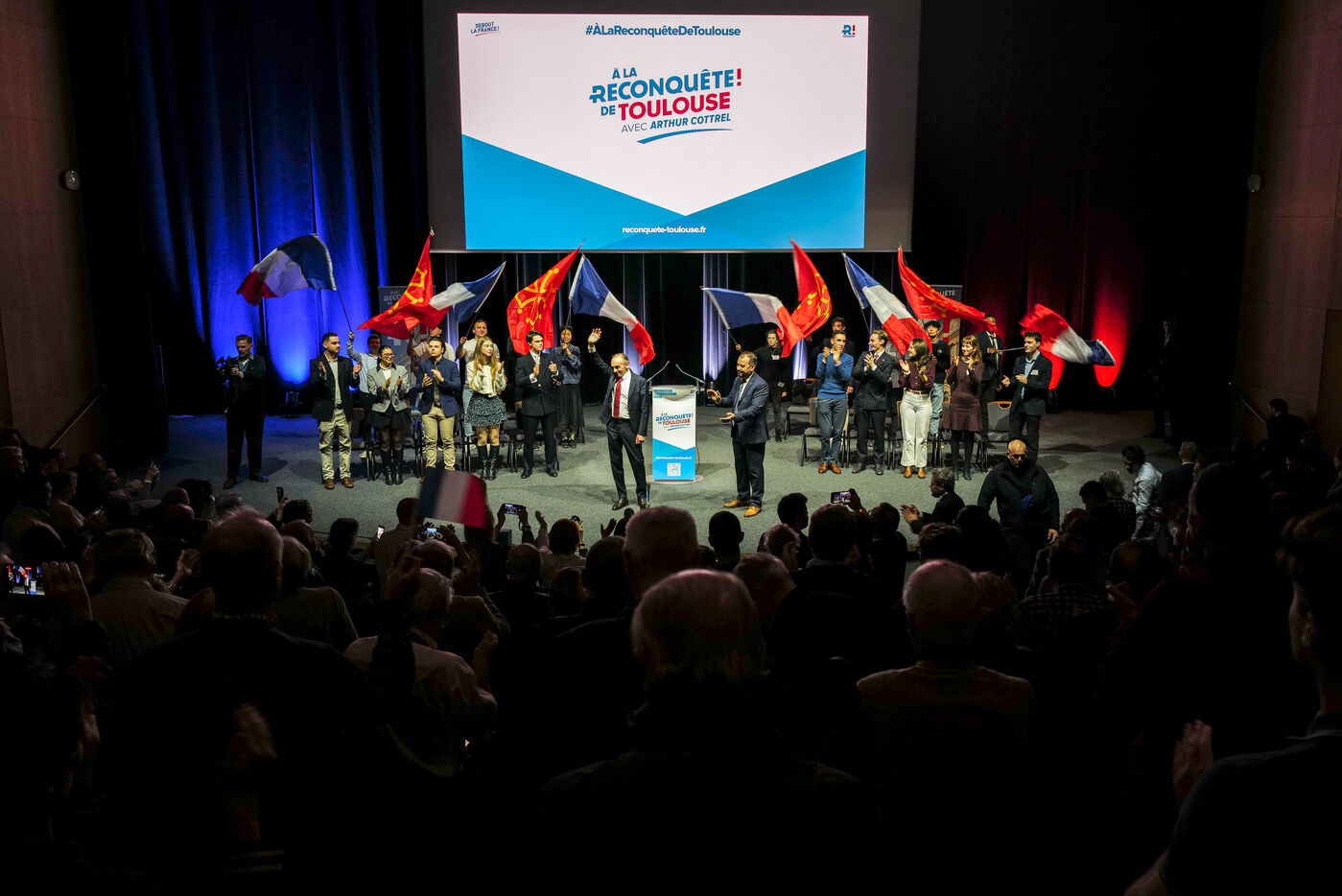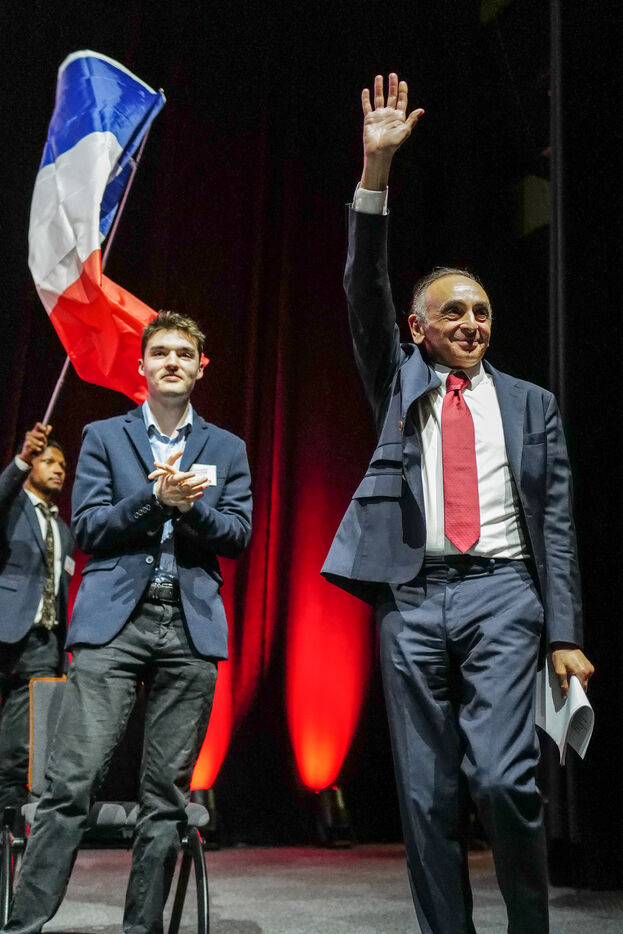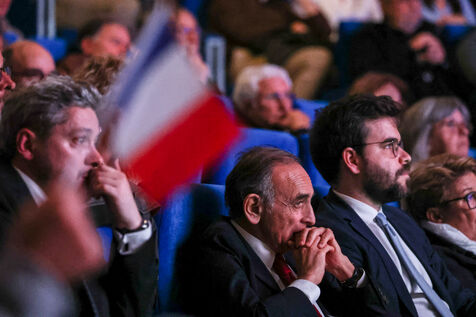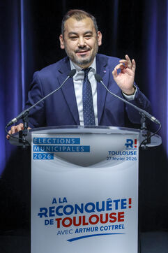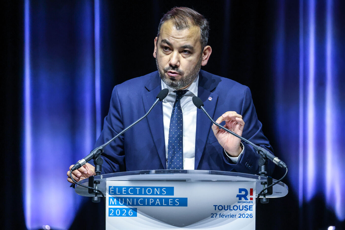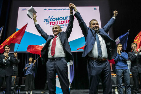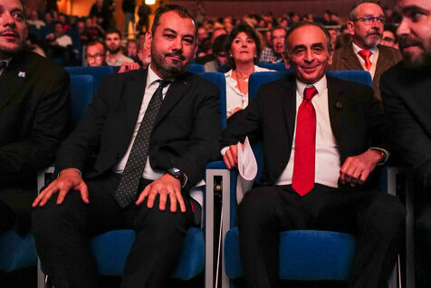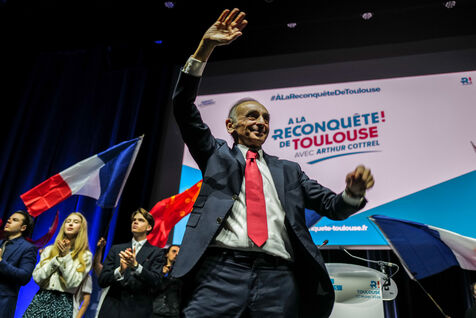 France, Toulouse, 2026-02-27. Eric Zemmour, far-right journalist and polemicist, with Arthur Cottrel, candidate for the Reconquête political party in the upcoming municipal elections in Toulouse in March 2026, during a meeting at the Pierre Baudis conference centre.