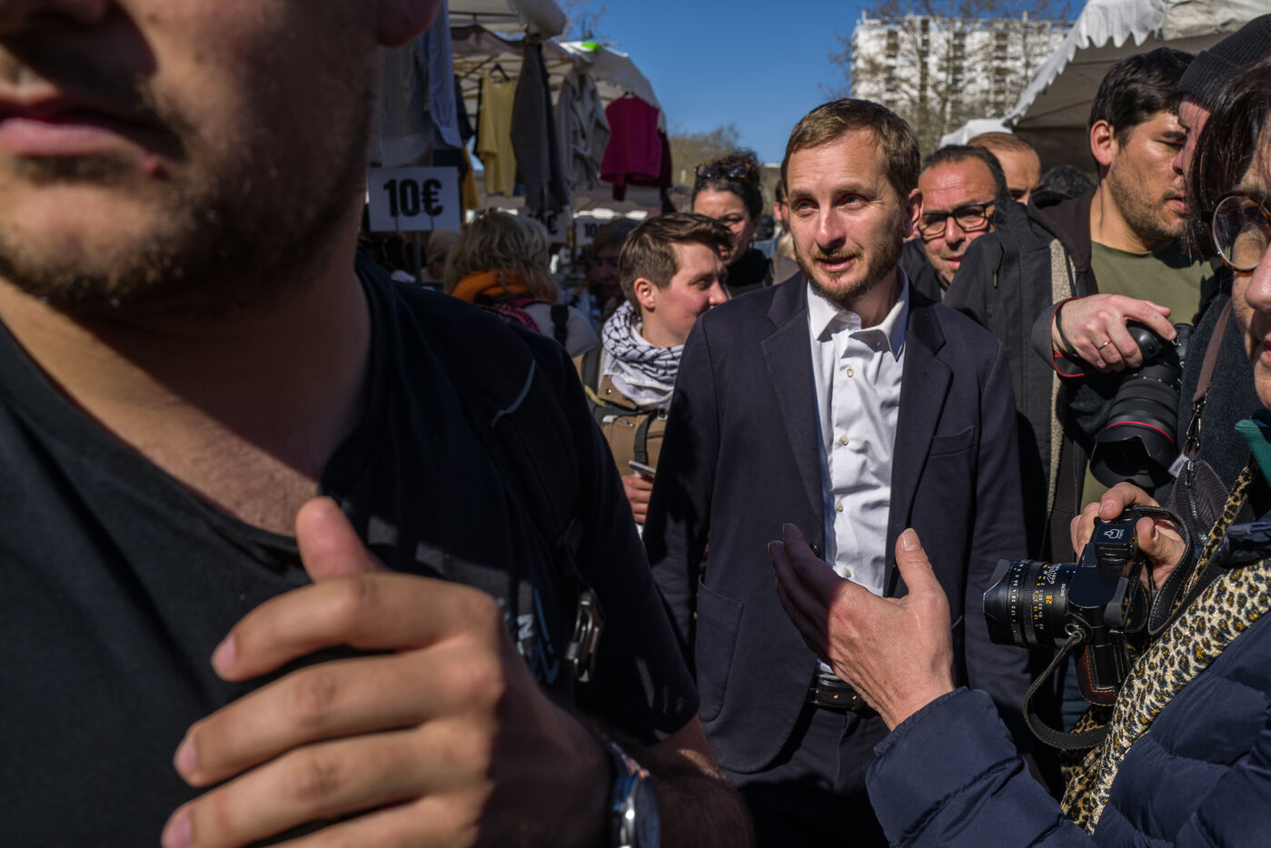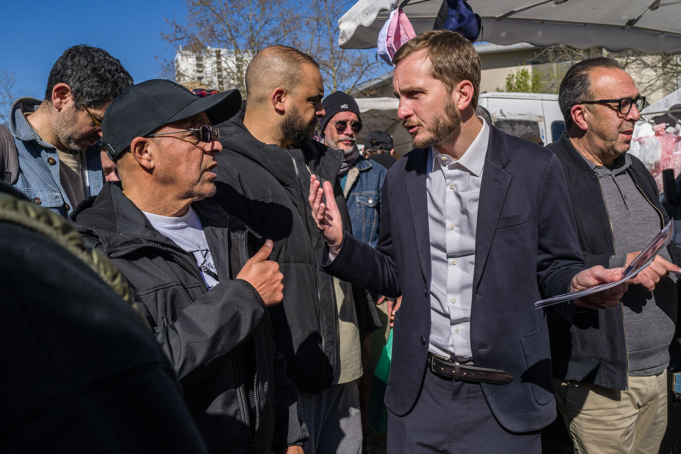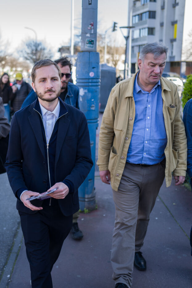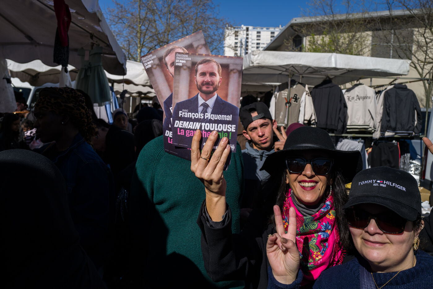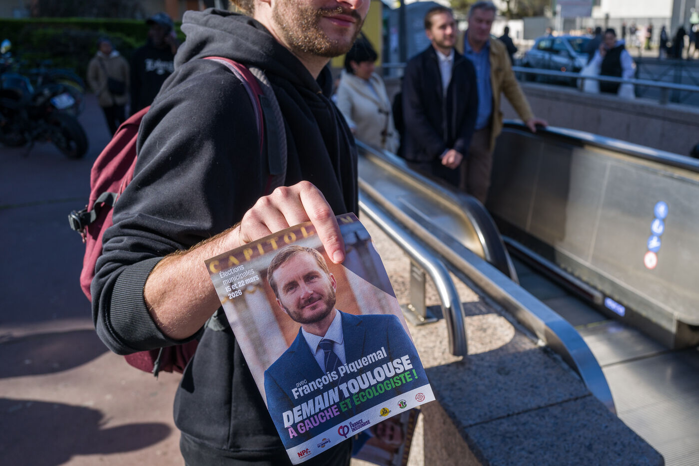 François Piquemal, LFI (left), and François Briancon, PS (right), walk through the Bagatelle district and its market to hand out leaflets ahead of the second round of municipal elections scheduled for March 22nd against Jean-Luc Moudenc, the current Mayor of Toulouse.