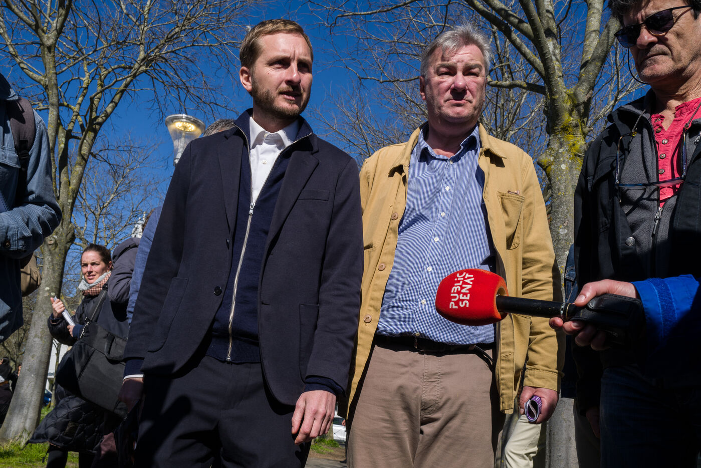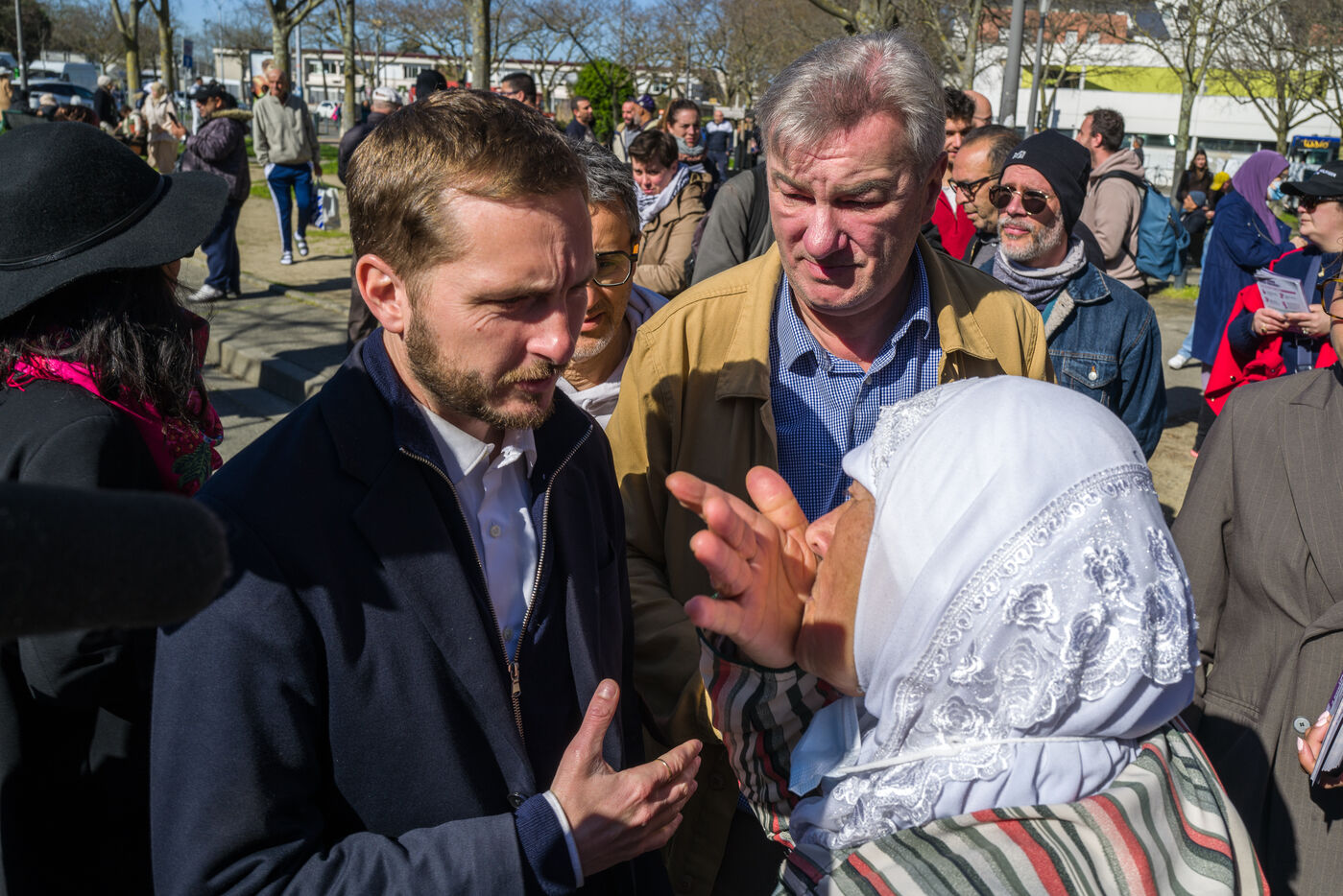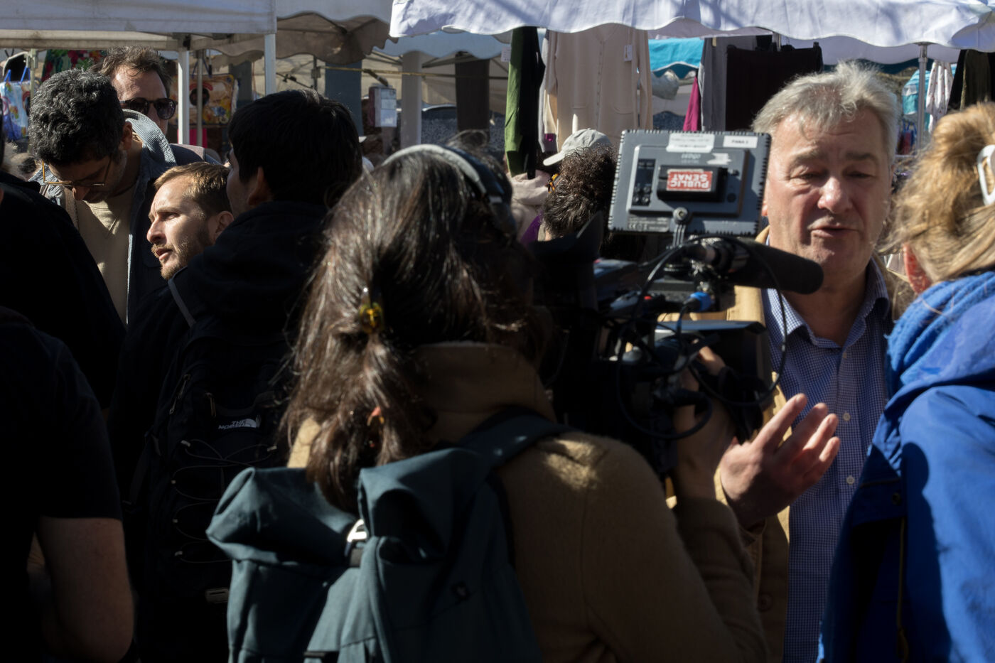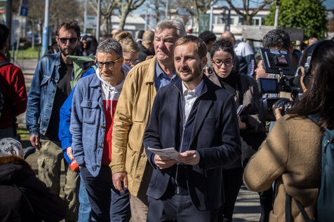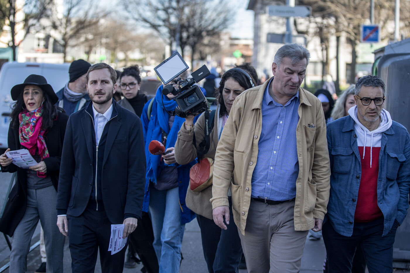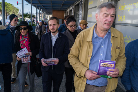 François Piquemal, LFI (left), and François Briancon, PS (right), walk through the Bagatelle district and its market to hand out leaflets ahead of the second round of municipal elections scheduled for March 22nd against Jean-Luc Moudenc, the current Mayor of Toulouse.