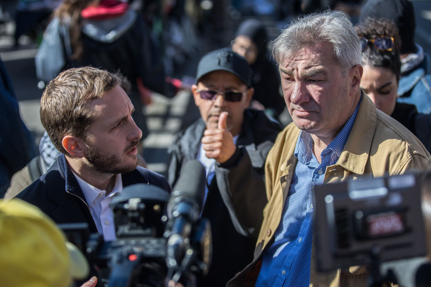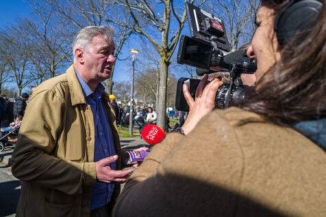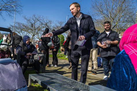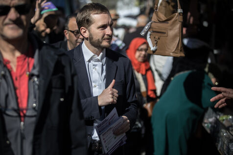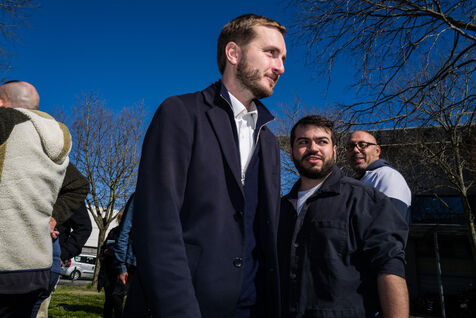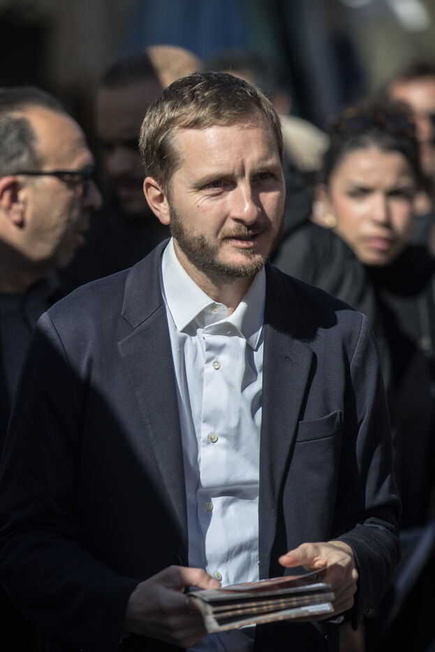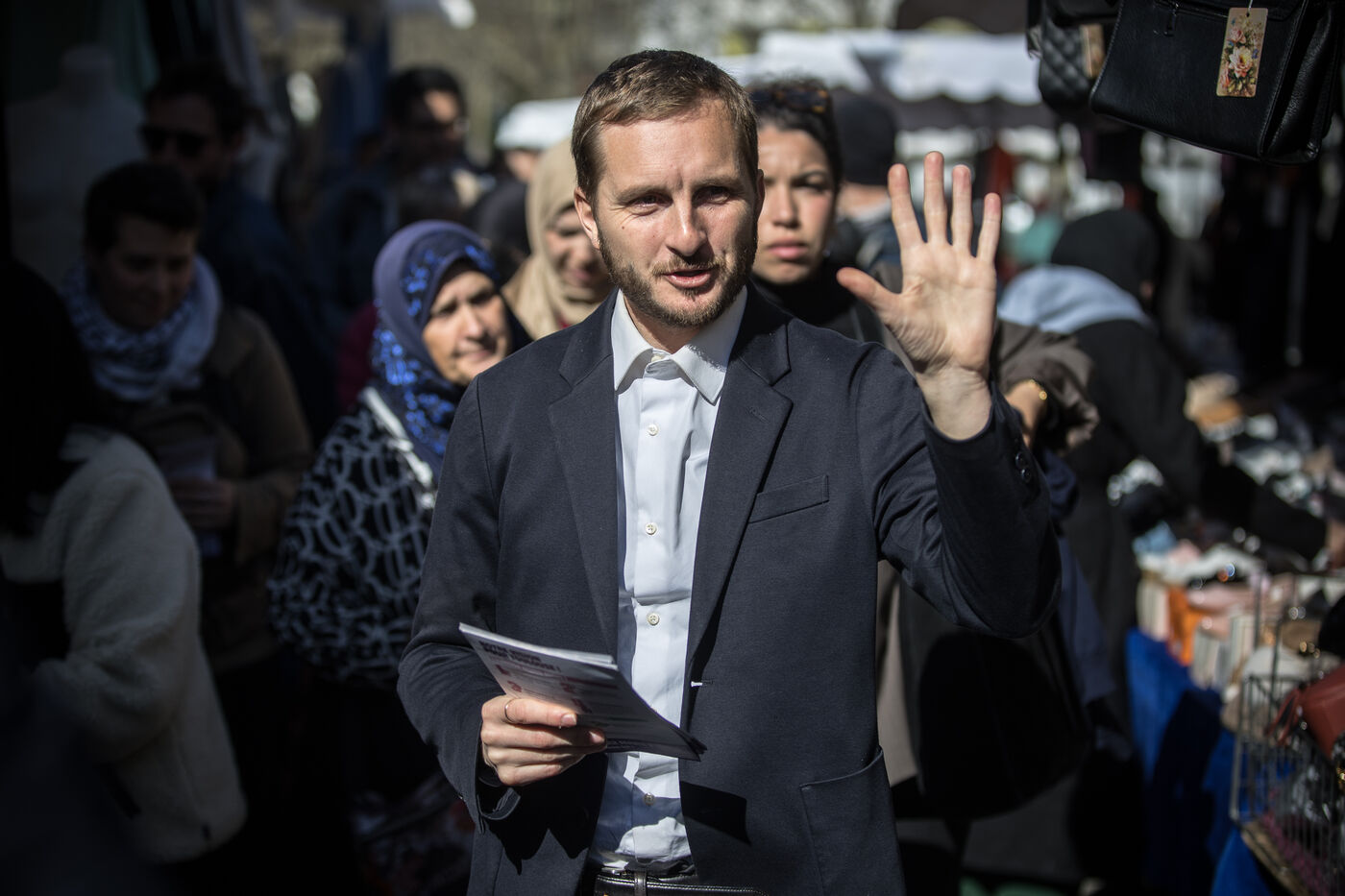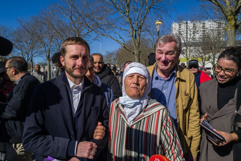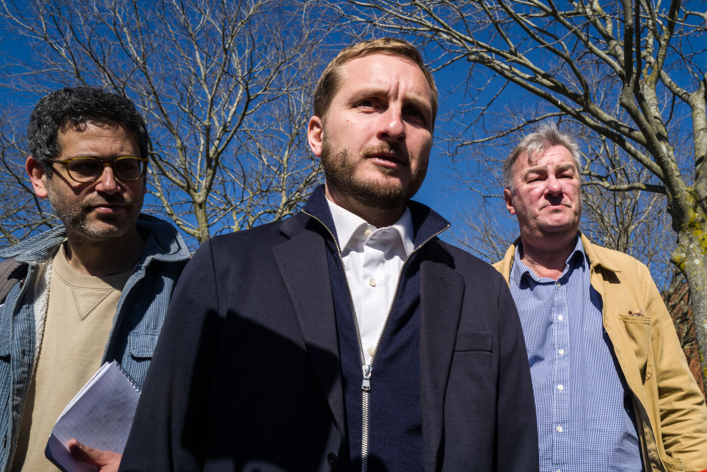François Piquemal, LFI (left), and François Briancon, PS (right), walk through the Bagatelle district and its market to hand out leaflets ahead of the second round of municipal elections scheduled for March 22nd against Jean-Luc Moudenc, the current Mayor of Toulouse.